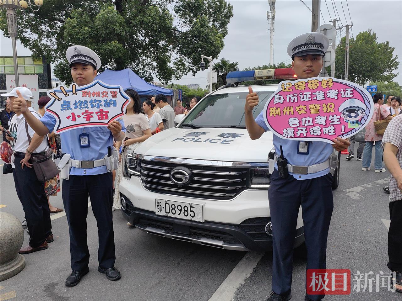 上午8时许,新闻记者在沙市五中考点入口处看到,执勤民警们举着“点燃你的小宇宙”“旗开得胜”“是时候展示真正的实力了”的展示牌,站在车牌尾号为“985”的警车旁,为进入考场的学子们加油鼓劲。