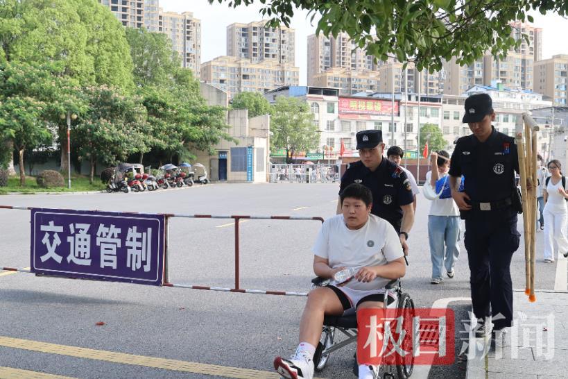 6月7日8时许,通城县通城一中考点上演暖心一幕:考生徐豪因两个月前在校打篮球时膝盖骨折,只能坐轮椅参加高考。通城县公安局反恐怖和巡特警大队执勤民警发现后,当即启动应急保障机制,开辟绿色通道全程护送。