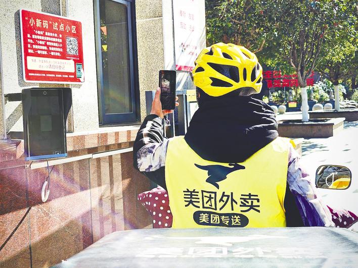 黄州区内,外卖小哥通过扫描“小新码”进入小区。(湖北日报全媒记者 曹雯 摄)