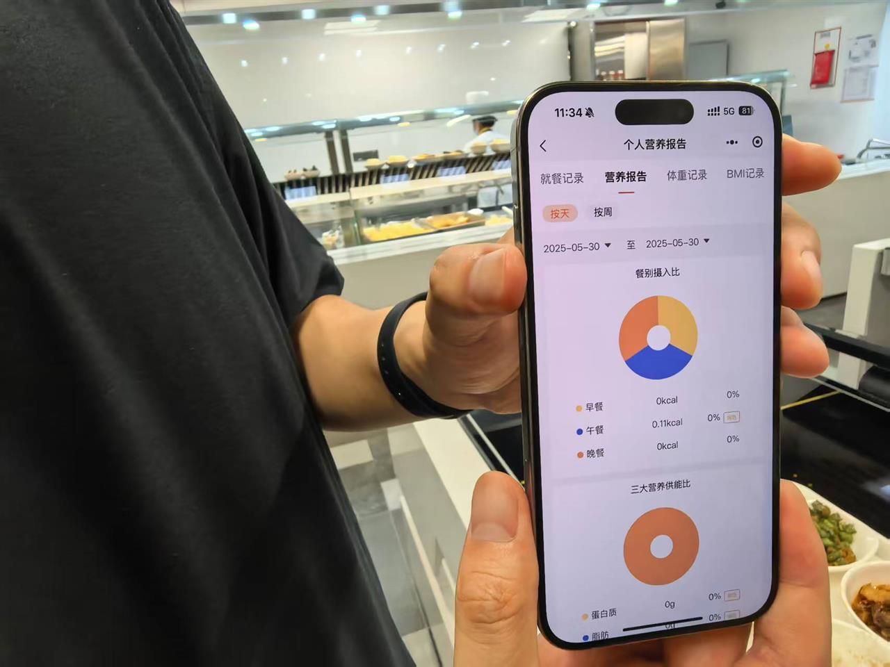 “午餐摄入110卡路里(偏低),摄入钾0.1毫克,钠0.13毫克……”同时,在他的手机端同步生成一份午餐个人营养报告。