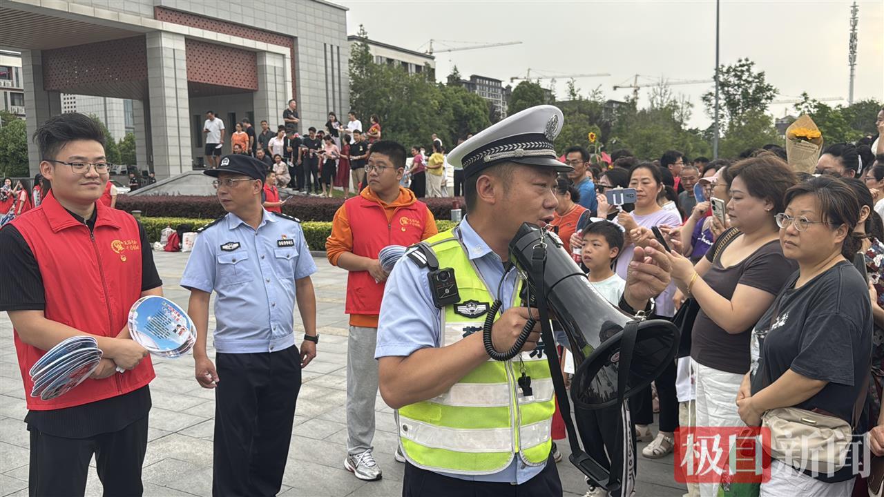 随着考生车队即将出发前往考场,现场气氛逐渐热烈起来。民警和志愿者们与家长们自发组成“助威团”,大家挥舞着手中印有“高考加油”字样的反诈扇,民警还特意准备了加油举牌,上面写着“年轻不服输,勇敢往前冲”“全力以赴,一举夺魁”等暖心话语。“同学们加油,你们是最棒的!”“沉着冷静,稳定发挥!”一声声激昂有力的助威呐喊此起彼伏,饱含着对考生的鼓励与期待,为即将奔赴考场的学子们注入信心与力量。