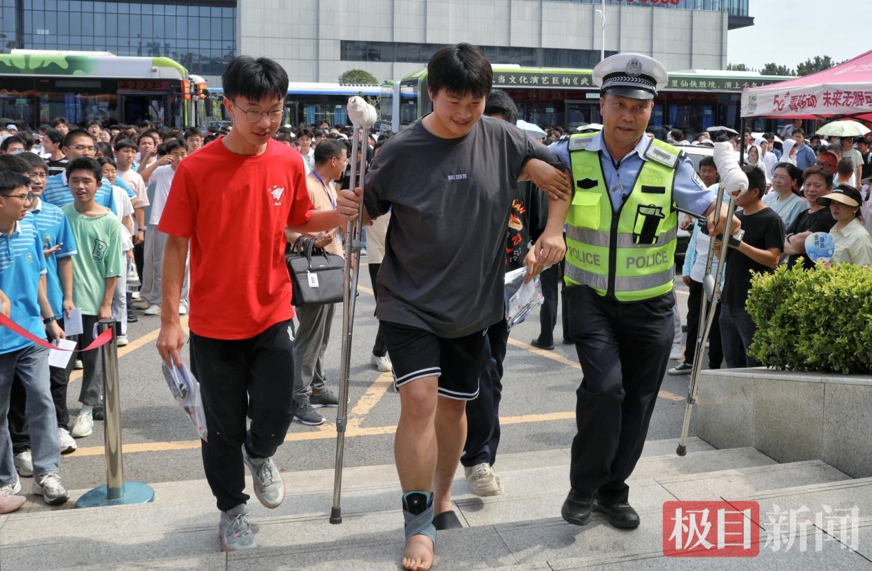 高考前一天,考生们陆续前往考点熟悉环境。襄阳四中的尹同学因脚部骨折行动不便,一瘸一拐地走进襄阳三中考点时,被正在考点巡逻的治安大队民警发现。