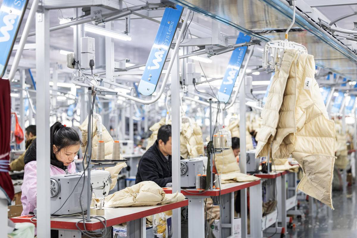 在天门中国服装电商城湖北米然服饰有限公司生产车间,智能吊挂流水线有序运转,工人在工位上赶制出口订单。(湖北日报全媒记者 任勇 通讯员 熊文婷 江文驰 摄)