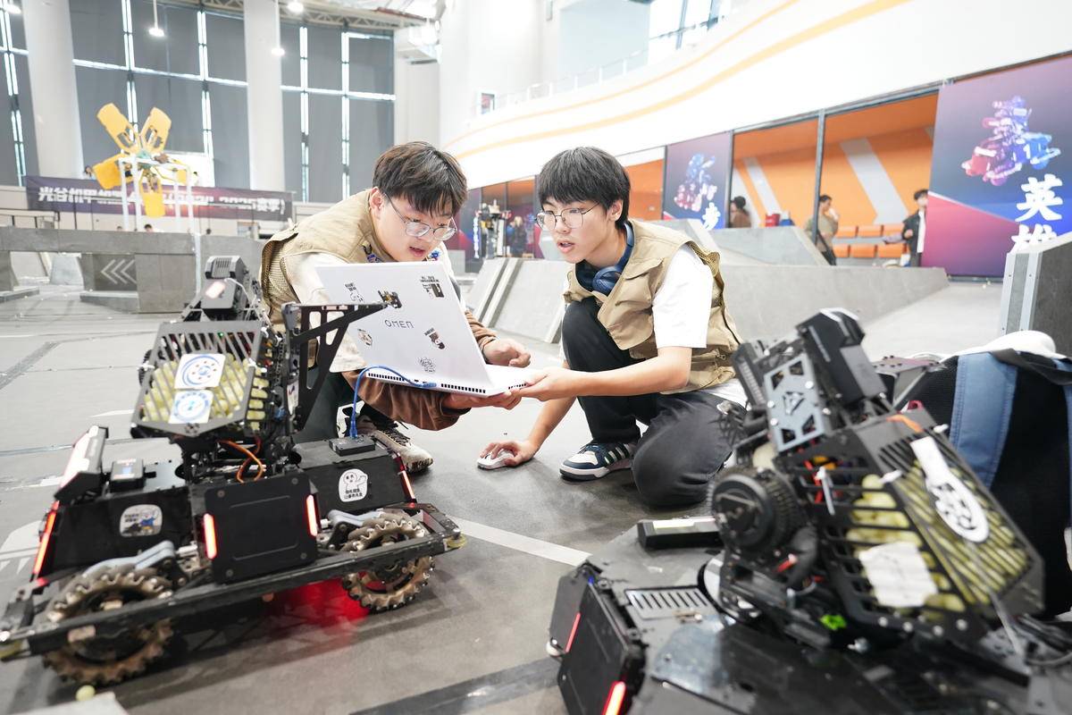 光谷机器人生态创新中心机甲机器人比赛场,一场机甲机器人比赛正在激烈进行。(湖北日报全媒记者 魏铼 通讯员 张希祉 摄)
