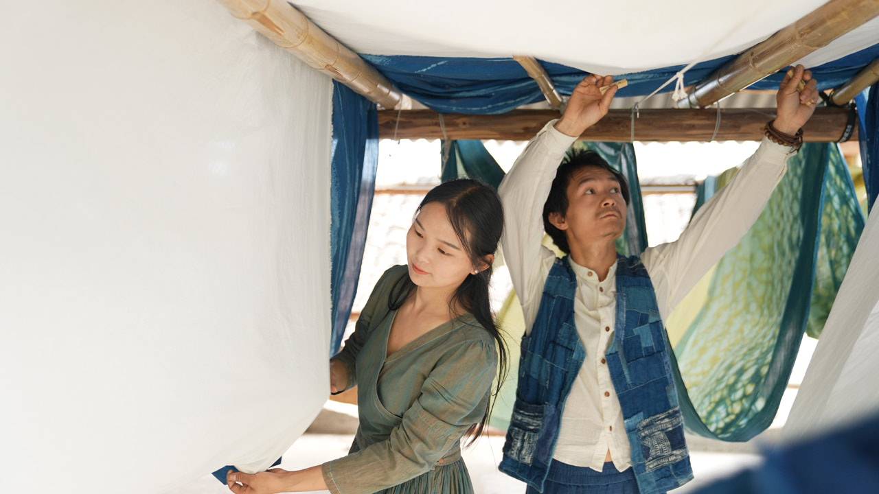闲暇时,夫妻俩常散步、拍照,接待进山体验的家庭,共同采染料、染布、画画……慢慢地,“荒蓝入野”的环保理念逐渐被更多人知晓、认可。