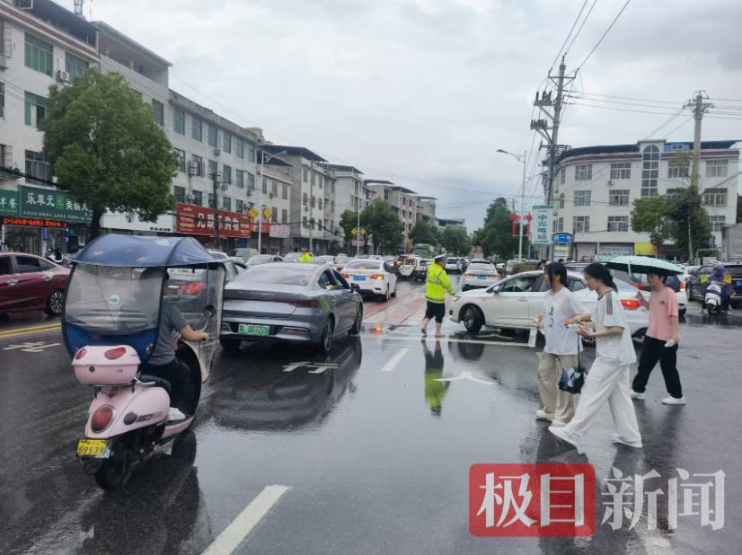 6月7日高考首日下午,通城县骤降滂沱大雨。恰逢考试散场时分,为保障考生安全有序离场,通城县公安局执勤民警冒雨坚守岗位。