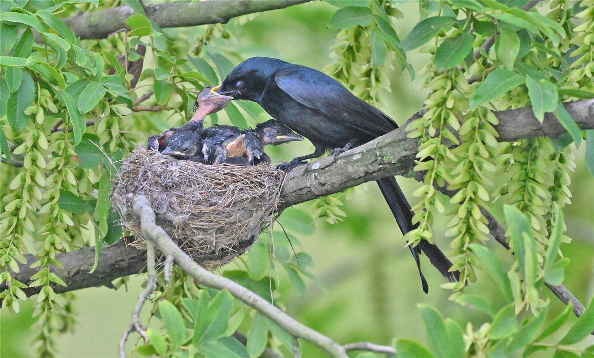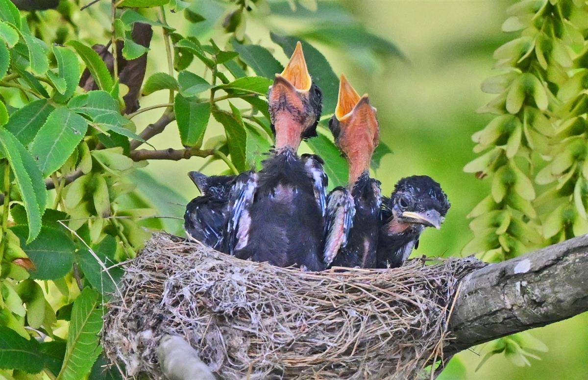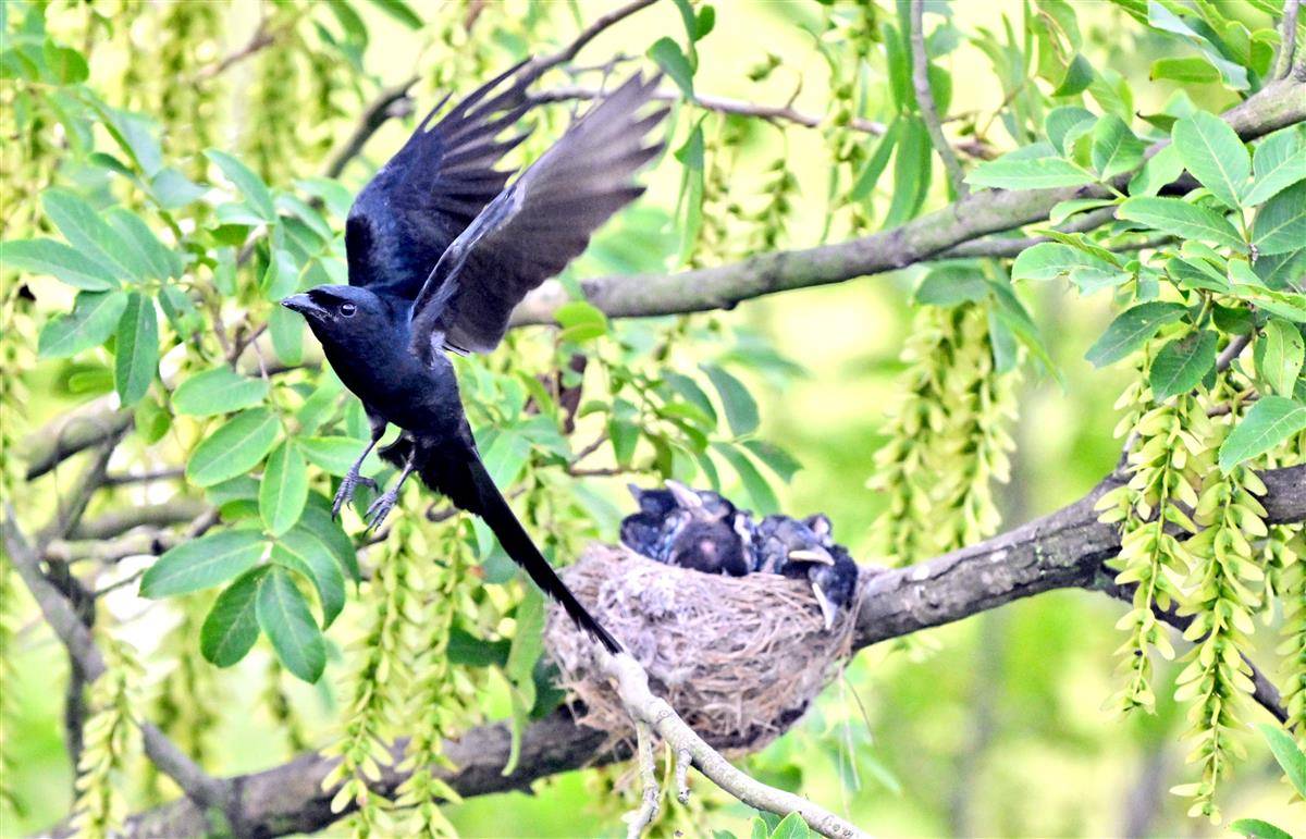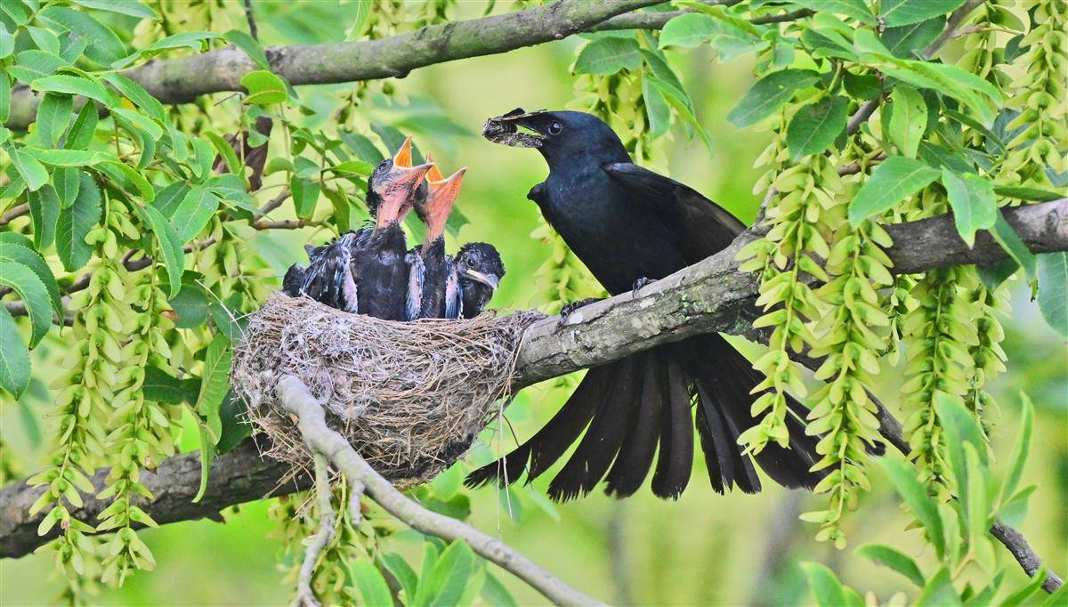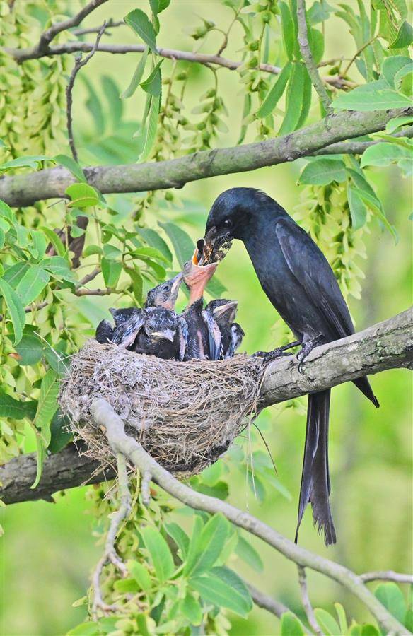 6月15日清晨,宜昌长江岸边的卷桥河湿地丛林里,两窝黑卷尾鸟迎来新生命——雏鸟全部破壳孵化。鸟父母正穿梭枝叶间,用翅膀划出守护家园的弧线:成鸟时而空中叼住飞虫,俯冲到巢边喂给张大黄喙的雏鸟;时而衔起巢内排泄物飞往远处,为绒毛未丰的幼鸟保持环境清洁,巢中雏鸟蜷缩着发出细弱啾鸣。眼下正值鸟类繁殖旺季,宜昌长江湿地已化身"育儿天堂":芦苇荡与丛林深处,白鹭、夜鹭等水鸟巢穴星罗棋布,黑卷尾等林鸟在枝桠间筑巢安家。近年来,当地通过植被修复、栖息地保护等举措提升生物多样性,人鸟和谐的图景,正成为长江岸线生态复苏的鲜活注脚。(湖北日报全媒记者 刘曙松 摄)