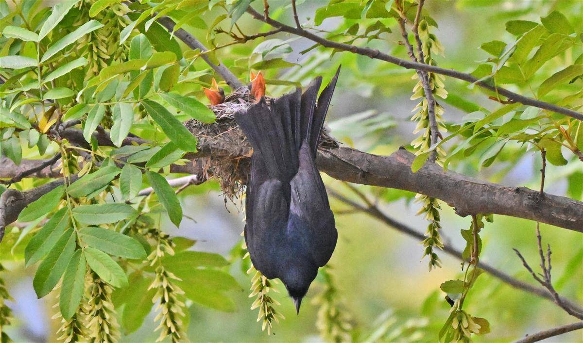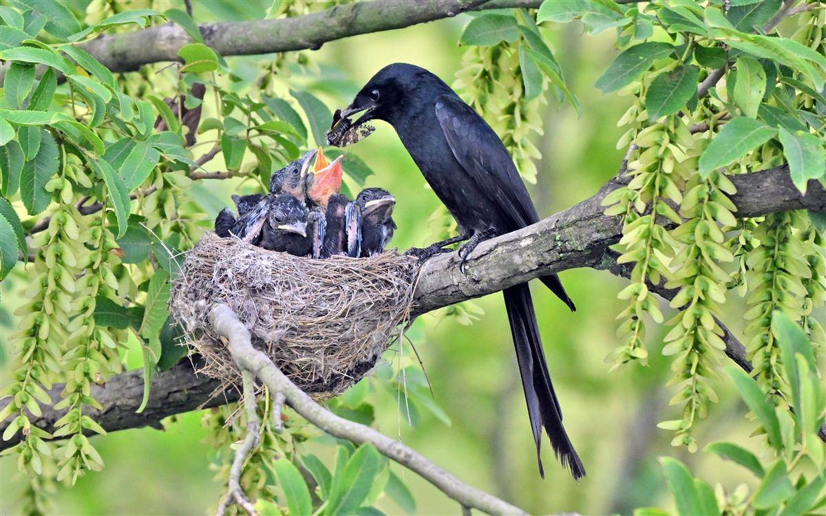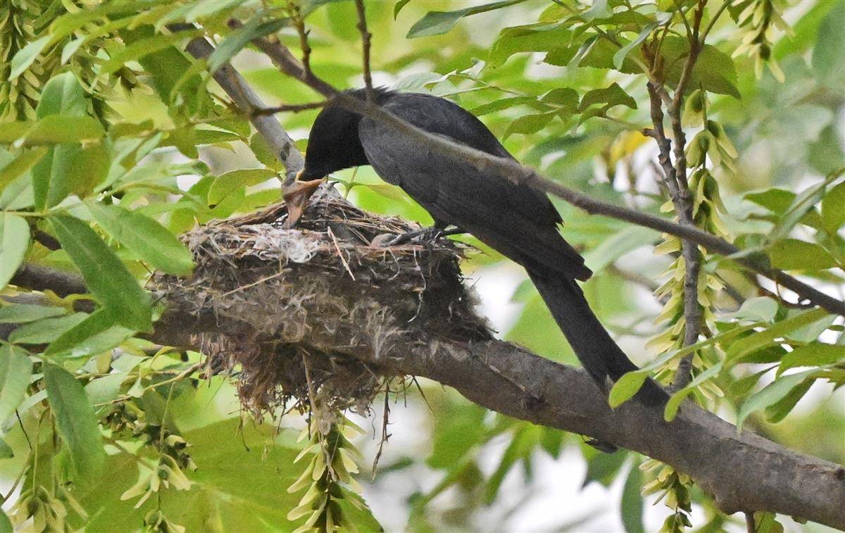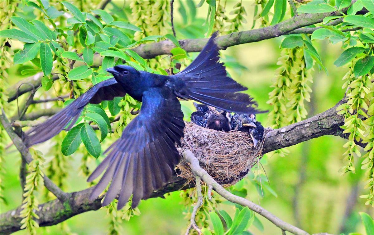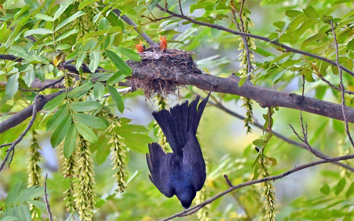 6月15日清晨,宜昌长江岸边的卷桥河湿地丛林里,两窝黑卷尾鸟迎来新生命——雏鸟全部破壳孵化。鸟父母正穿梭枝叶间,用翅膀划出守护家园的弧线:成鸟时而空中叼住飞虫,俯冲到巢边喂给张大黄喙的雏鸟;时而衔起巢内排泄物飞往远处,为绒毛未丰的幼鸟保持环境清洁,巢中雏鸟蜷缩着发出细弱啾鸣。眼下正值鸟类繁殖旺季,宜昌长江湿地已化身"育儿天堂":芦苇荡与丛林深处,白鹭、夜鹭等水鸟巢穴星罗棋布,黑卷尾等林鸟在枝桠间筑巢安家。近年来,当地通过植被修复、栖息地保护等举措提升生物多样性,人鸟和谐的图景,正成为长江岸线生态复苏的鲜活注脚。(湖北日报全媒记者 刘曙松 摄)