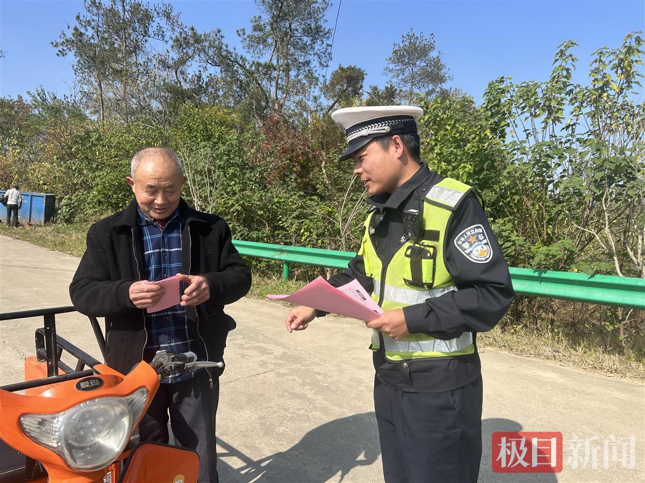 “师傅,骑摩托车要佩戴安全头盔,知道吗?”11月15日,湖北随州公安交管部门组织警力深入曾都区何店镇汪谌村,扎实开展“美丽乡村行”交通安全巡回宣传活动,将交通安全知识送到村民家门口。
