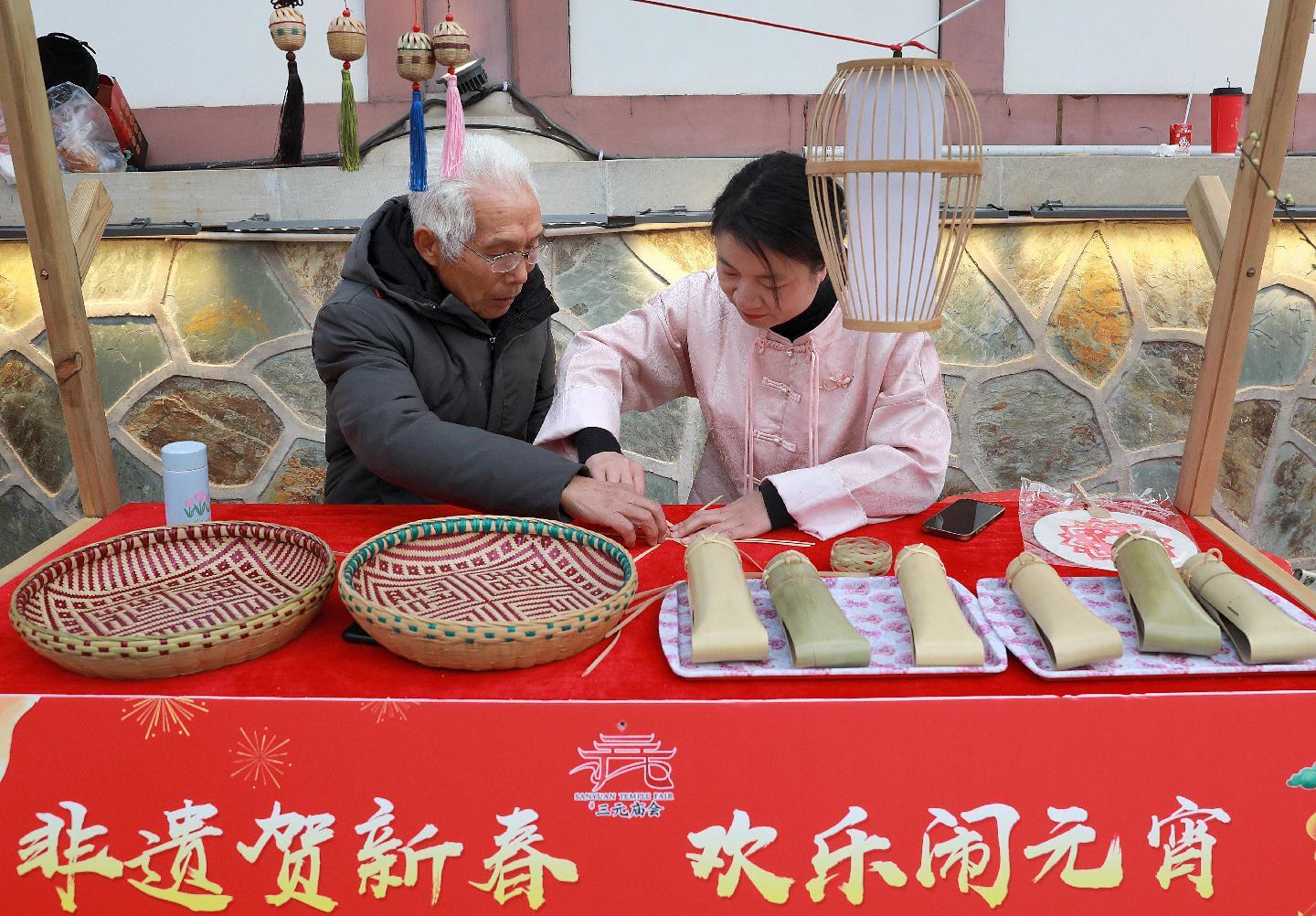 非遗贺新春 欢乐闹元宵”咸安区2025年元宵节“三元庙会”上,非遗竹编展示吸引市民游客体验
