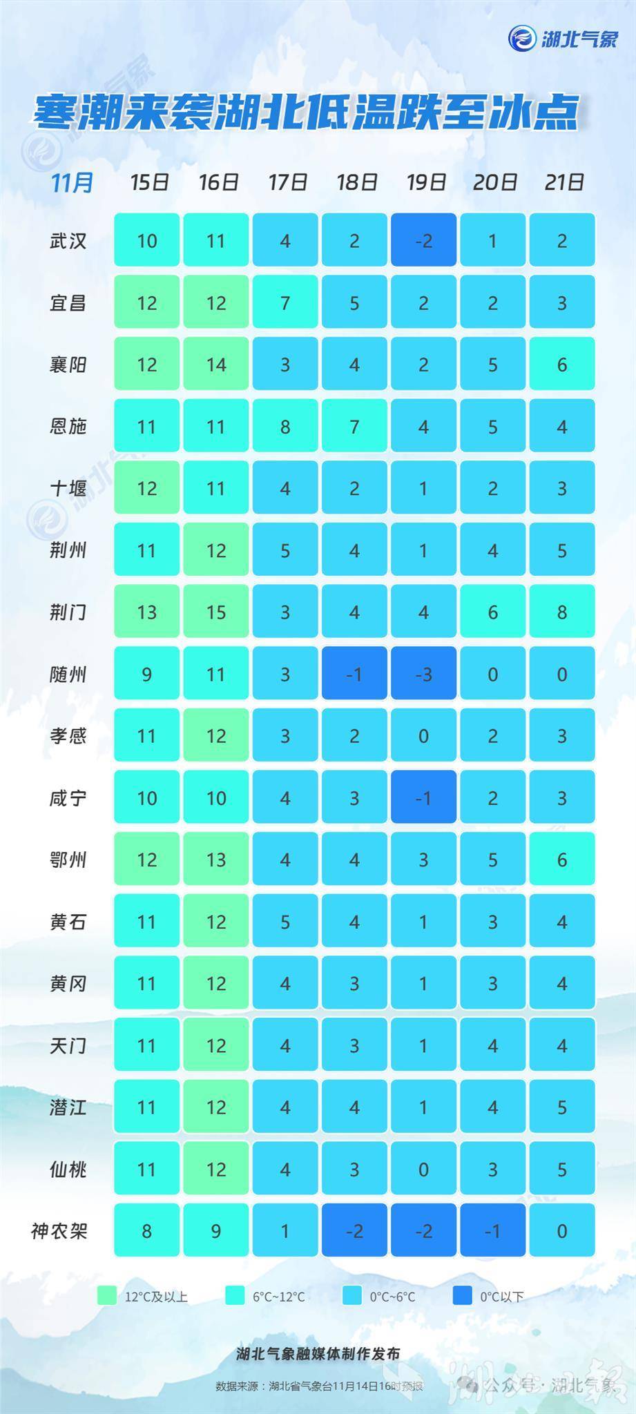 气象部门提醒:15日仍维持晴朗天气,公众可抓紧时间晾晒或外出赏秋。16日下午寒潮开始影响湖北,省内自西向东、自北向南将陆续出现雨雪、大风,气温将大幅下降,公众注意及时添衣加被和用火用电安全。雨雪天气尽量减少外出,行车注意减速慢行。