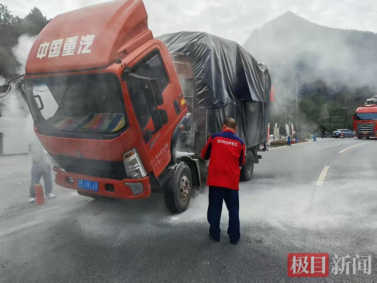 11月14日上午10时30分,货车司机何师傅正驾车行驶至318国道高家堰镇路段,突然发现车头位置冒出浓烟并窜出火苗,火焰很快扩散至驾驶室后排。何师傅迅速靠边停车、熄火,随即奔向不远处的中石化长阳青龙山加能站求助。