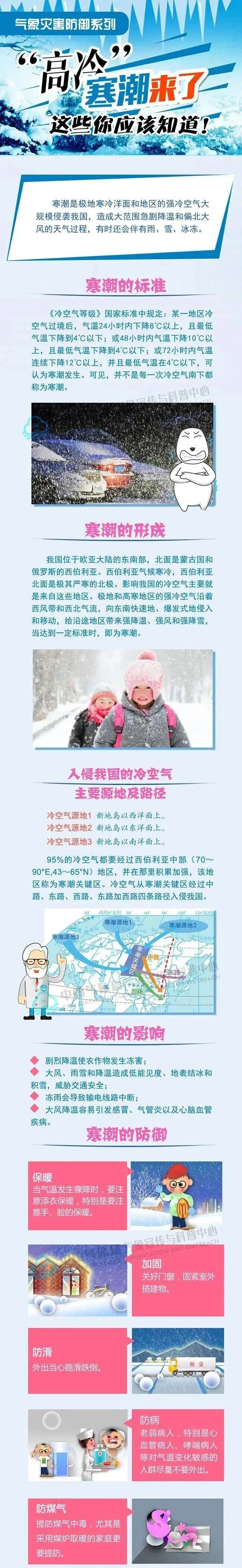 本次寒潮降温猛烈,北风强劲,风寒效应明显,提醒大家及时添加衣物,特别是老人小孩,要做好防寒保暖工作,注意防范心脑血管和呼吸道疾病。公众外出时还需远离广告牌、大树和临时搭建物,谨防高空坠物。此外雨雪天气易导致道路湿滑,公众驾驶车辆请谨慎慢行,注意交通安全。
