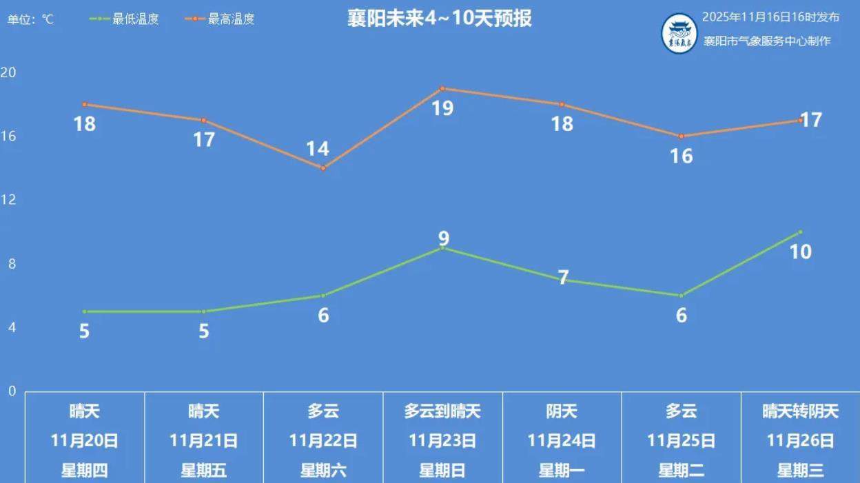 11月19日:晴天,偏北风转偏南风2~3级,2~14℃。