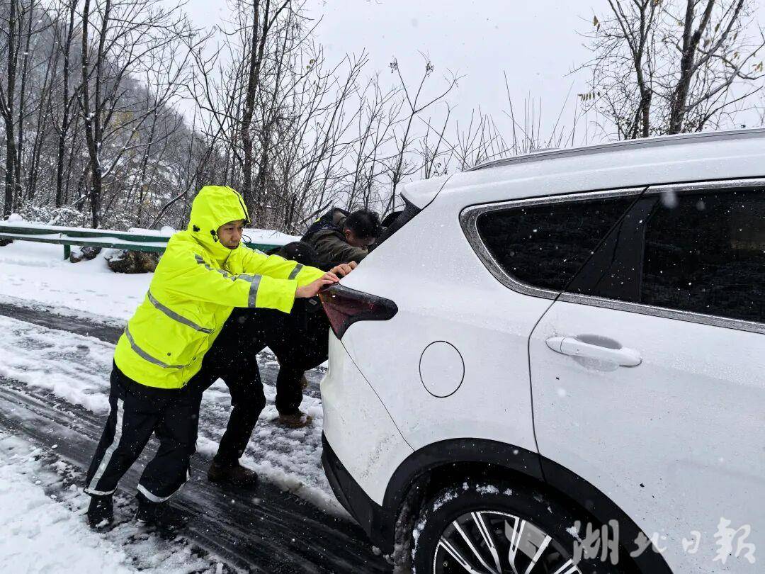 17日早晨,救援在多个角落同步展开。竹溪县桃源乡,一辆白色越野车在急弯处打滑。救援队负责人孙子绪与村民围拢上来,为车辆加装防滑链,双手冻得通红,仍一节节扣紧链条。丹江口市油瓶观村,车辆陷入雪窝失去动力,派出所副所长朱峰组织村民齐力上前,“一、二、三——推!”号子在风雪中格外响亮。