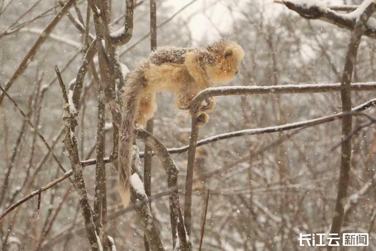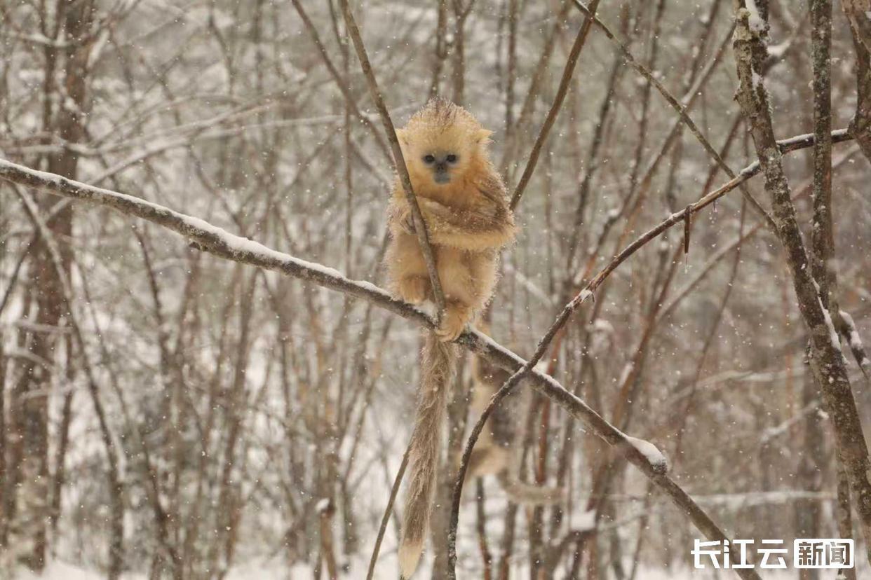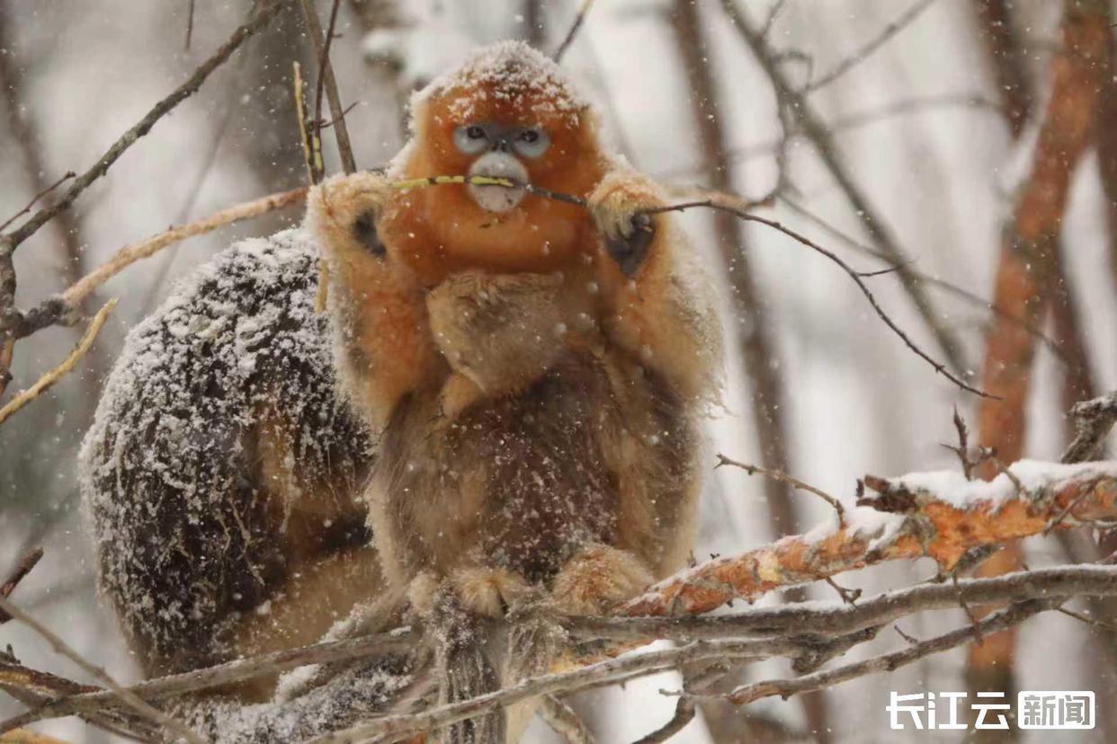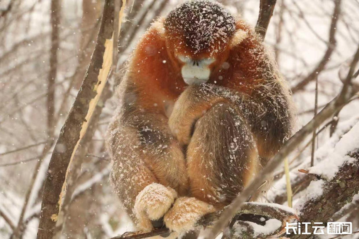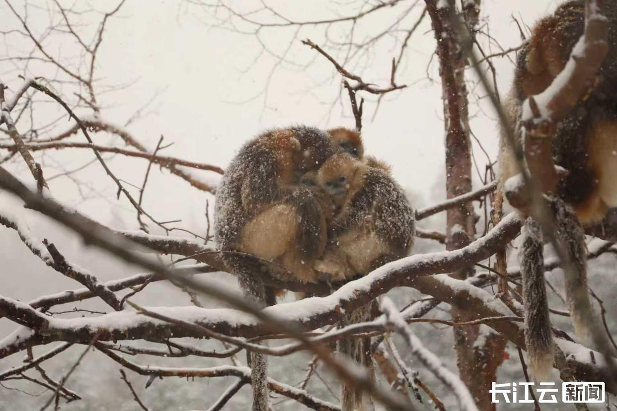 11月17日,受冷空气影响,湖北神农架林区日前迎来雨雪天气。洁白的雪花纷纷扬扬地飘落,一群金丝猴栖息在枝头,它们身上金黄色的毛发,此刻也沾染了晶莹的雪花,显得格外别致。