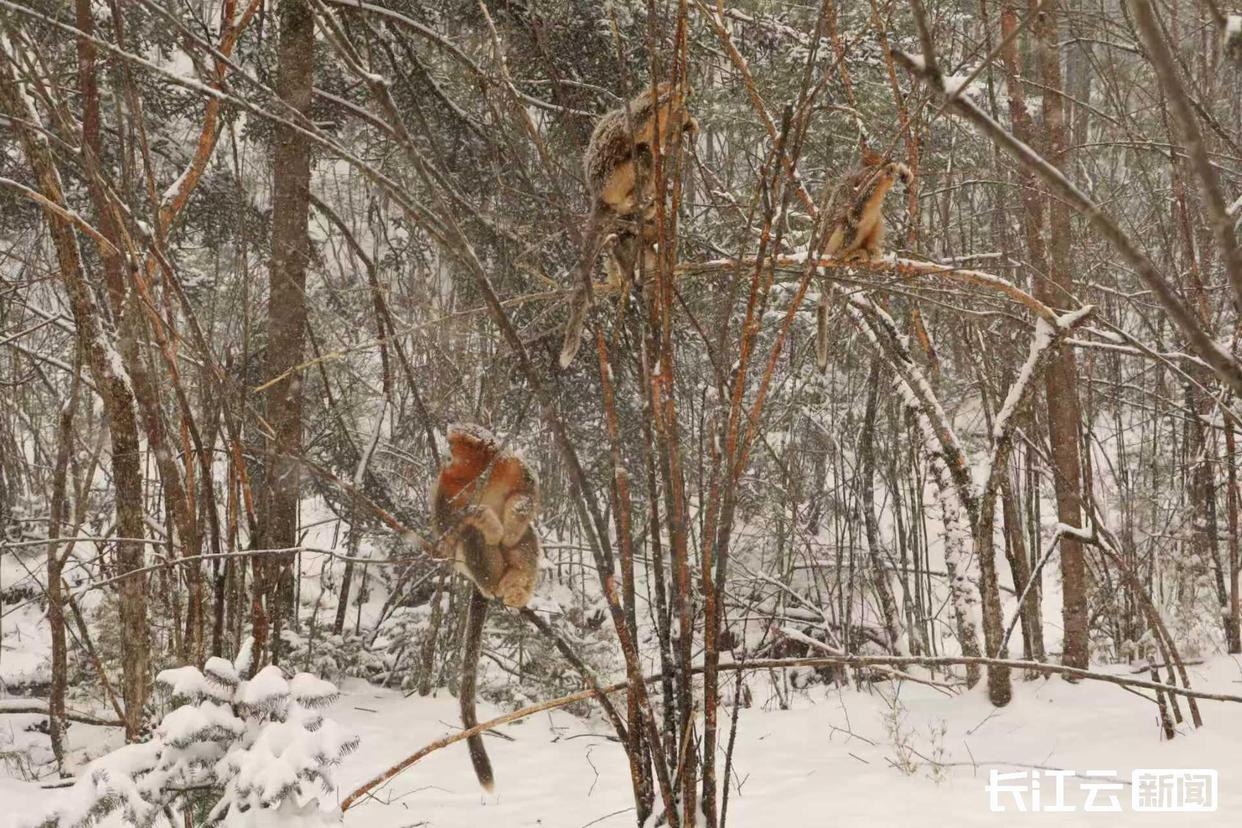 偶尔,一只调皮的小金丝猴会按捺不住活泼的天性,从同伴的怀抱中挣脱出来,在树枝间上蹿下跳,引得其他金丝猴发出阵阵叫声,为这寒冷的雪天增添了不少生机与活力。