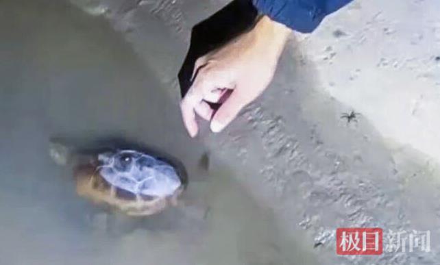 夜色中,在执法人员的见证下,王先生小心翼翼地将中华草龟捧起,缓缓放入水中。起初,这只草龟在岸边稍作停留,随后便摆动四肢,悠然游向江水深处。