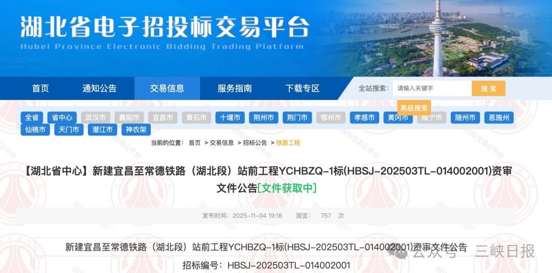 近日,湖北省电子招投标交易平台发布新建宜昌至常德铁路(湖北段)站前工程、工程监理等资审文件公告,意味着宜常铁路湖北段正式启动施工招标。根据招标文件,宜常铁路(湖北段)将于12月底开工建设,计划工期4年,预计2029年12月底建成通车。