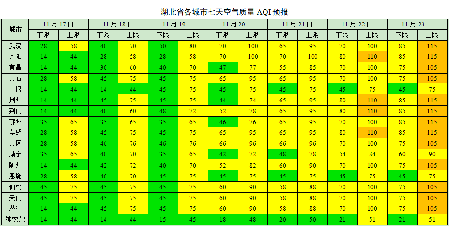 湖北日报讯(记者刘郸、通讯员李斌)11月18日,湖北省生态环境厅发布最新空气质量预测:11月下半月湖北空气质量整体较好,上游污染传输风险较小,22-23日、25-26日受不利气象条件下的本地污染物积累影响,部分城市可能有轻度污染过程。