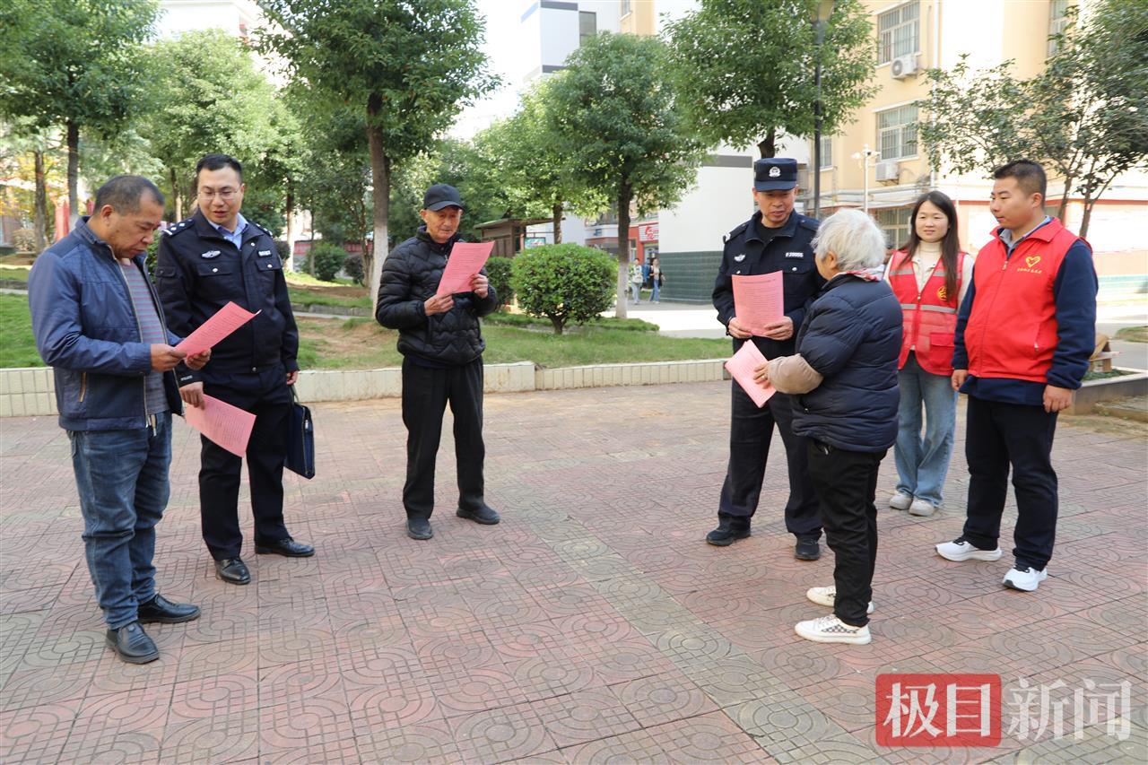 民警同社区辅警和志愿者向居民发放反电诈宣传单