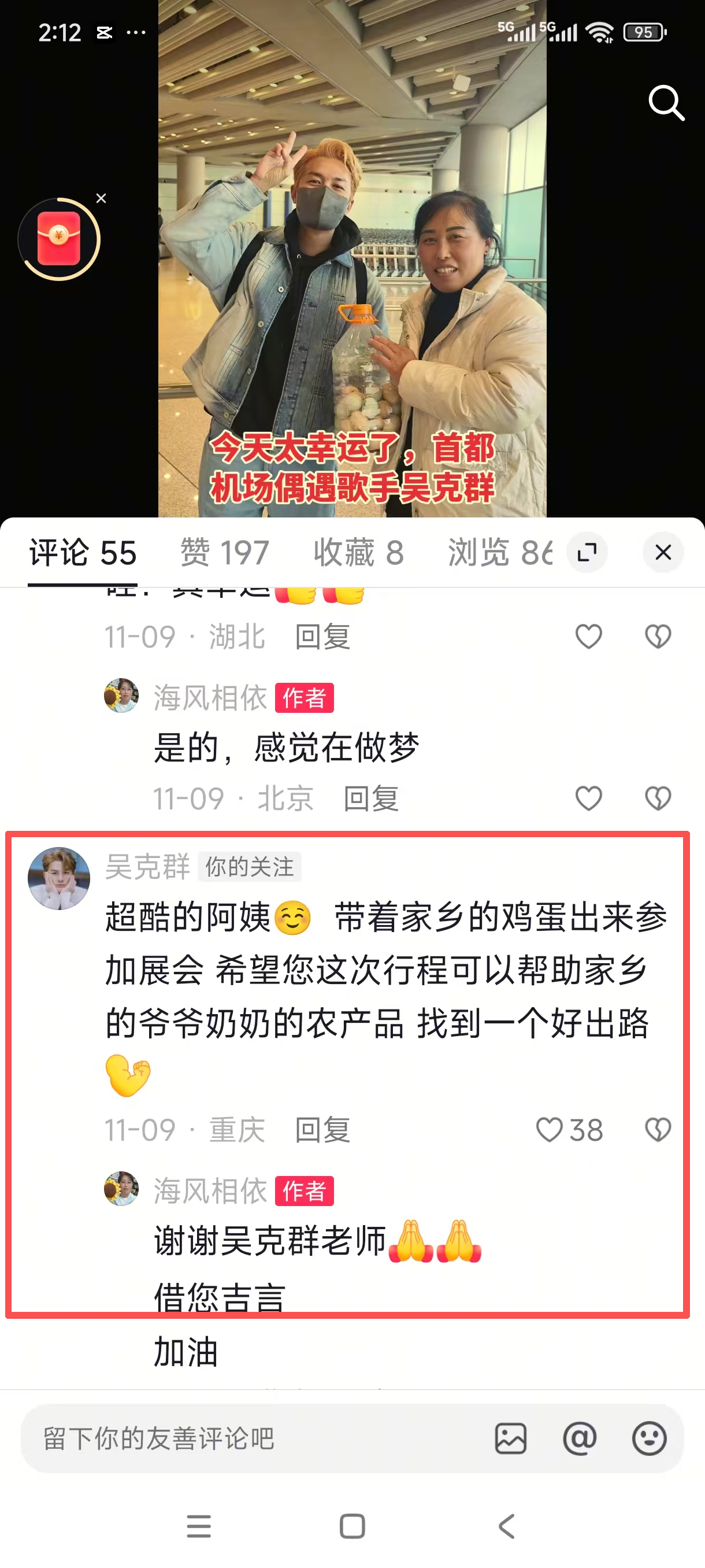 “超酷的阿姨,希望您这次行程可以帮助家乡爷爷奶奶的农产品,找到一个好出路!”当晚,邵锋锋在自己的抖音里分享了奇妙的一天,吴克群又在她的评论区留言鼓励。