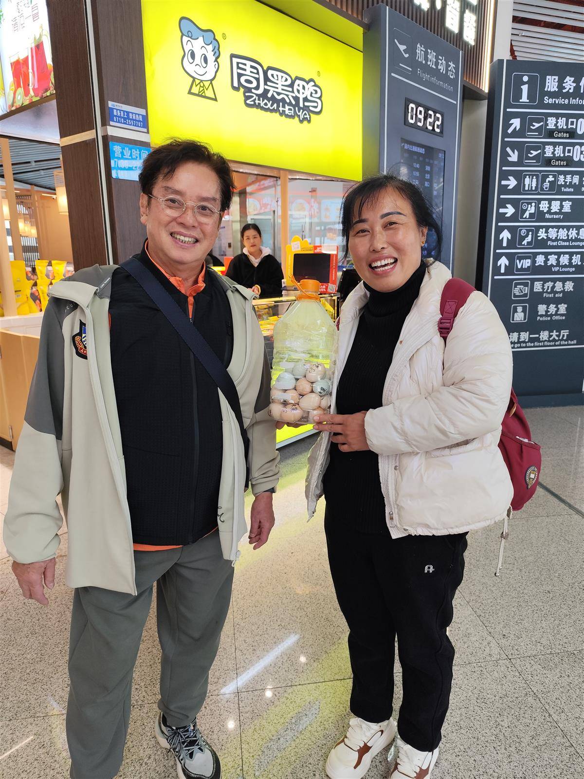 9日一早,邵锋锋来到襄阳刘集机场,见一群人举着手机拍照。她抱着油壶挤进人群一看,竟是大明星“校长”谭咏麟。邵锋锋鼓起勇气来到他身边说:“谭老师,我能跟您合影吗?”谭咏麟爽快答应。