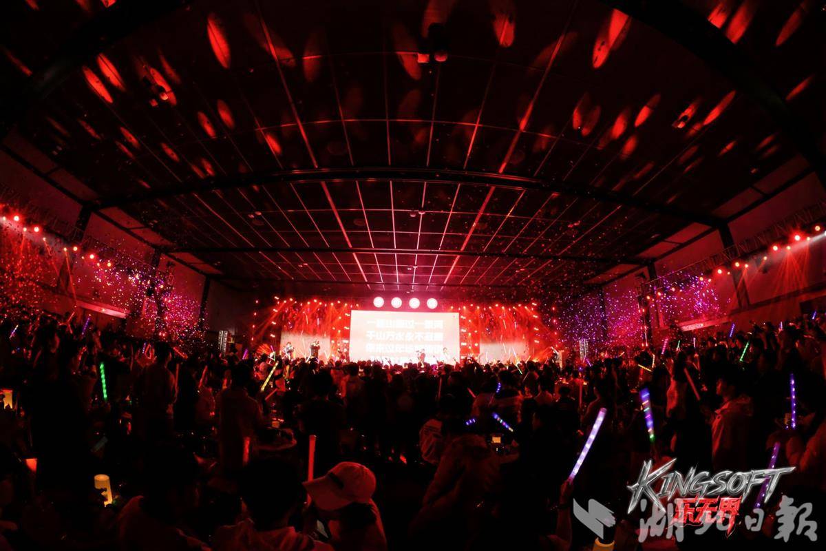 然而,就在这一片忙碌的氛围中,武汉金山软件园却画风突变!园区内张灯结彩,人声鼎沸,节奏强烈的鼓点和年轻的和声划破了夜的宁静。台上,是金山员工乐队和高校学子在激情对唱;台下,是数百名挥舞着荧光棒的年轻面孔,他们是金山的“同学”,也是此刻最投入的乐迷。