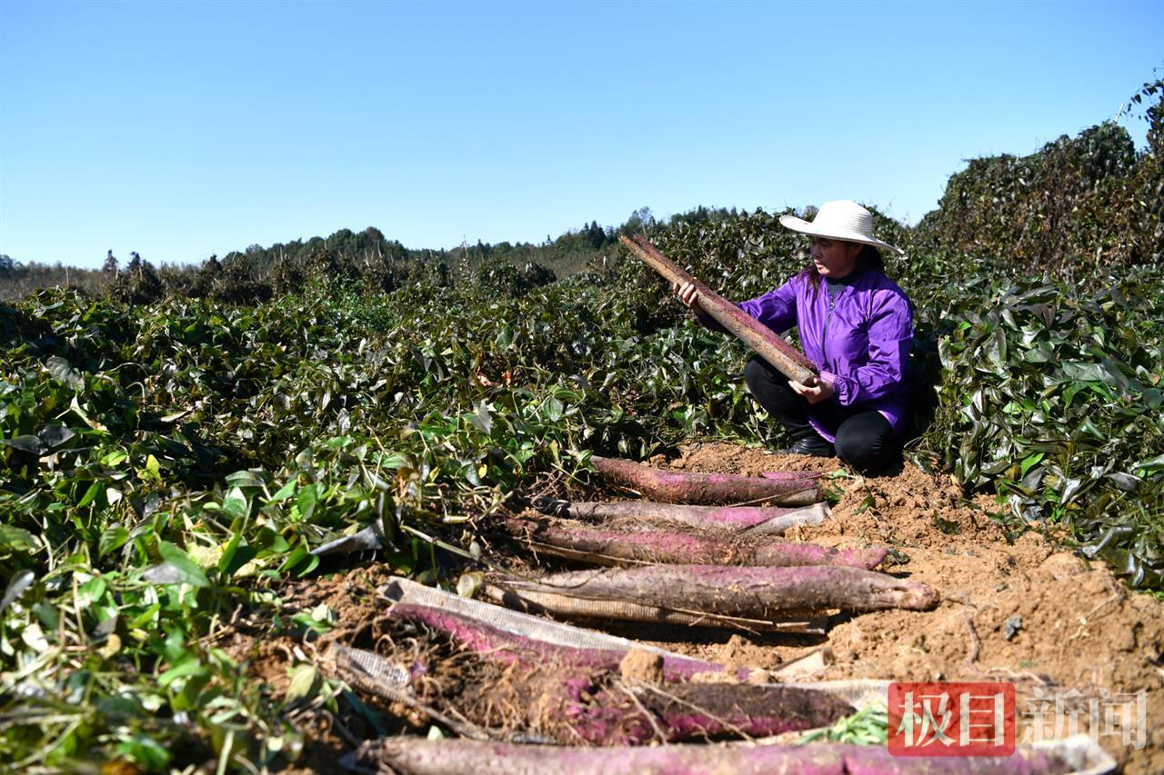“今年种植非常成功,亩产大概5000斤,长得好的有90厘米长!”通城县阳光农业专业合作社负责人吴三龙拿起一根刚出土的紫山药,喜笑颜开。