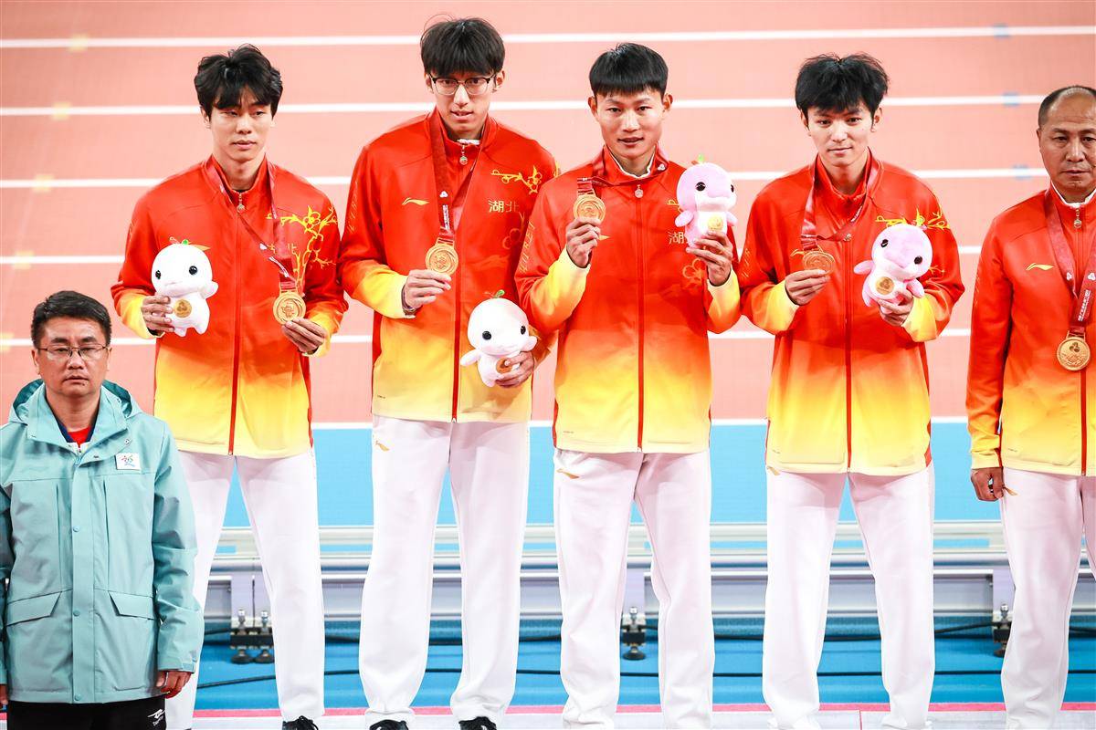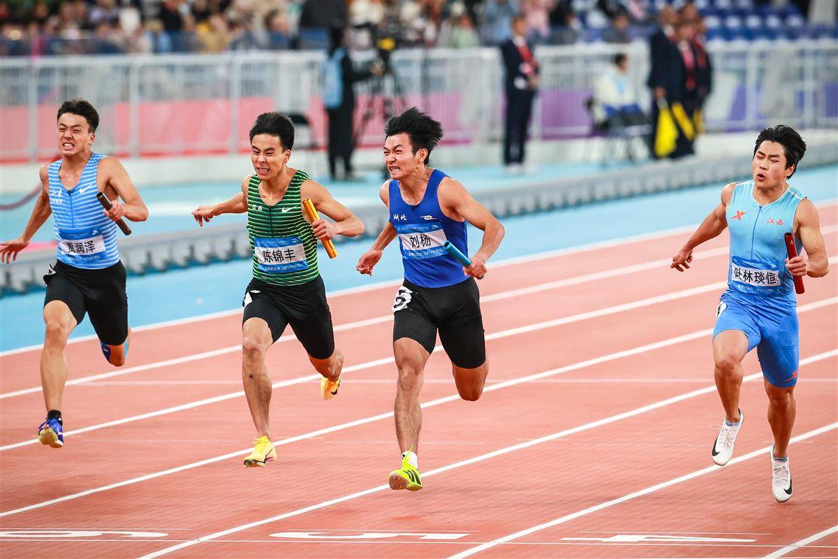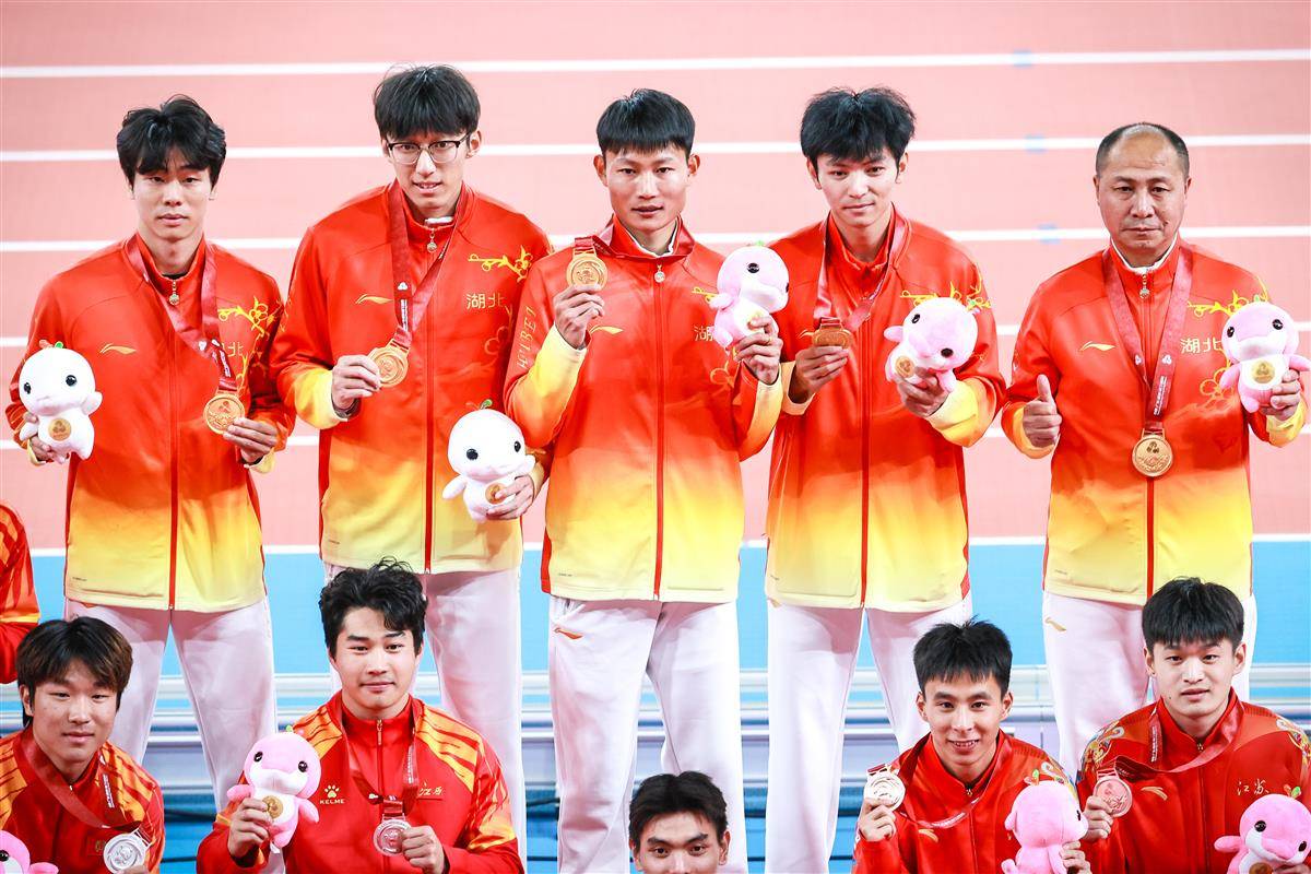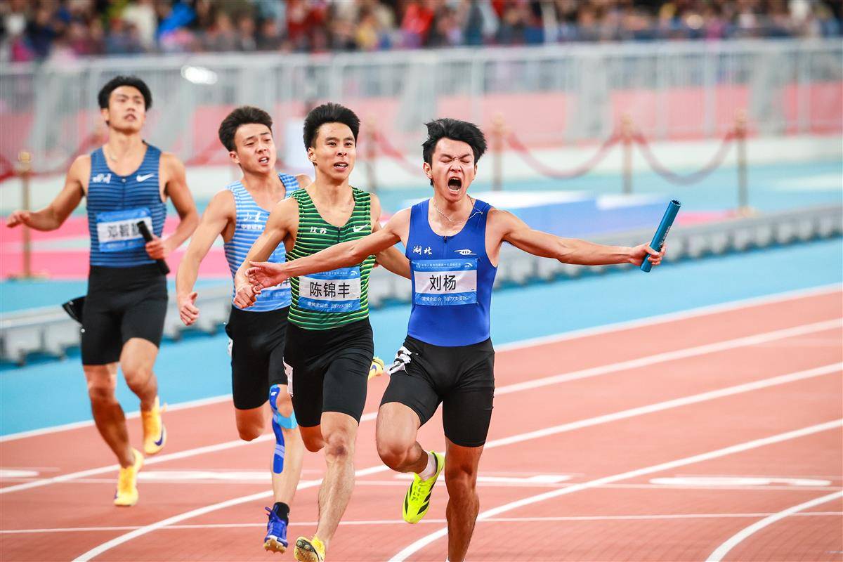 11月20日,第十五届全国运动会田径项目男子4×100米接力决赛在广州举行,湖北队斩获冠军。(湖北日报全媒记者 时龚 摄)