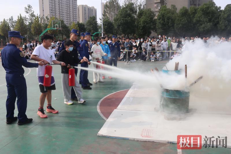 实操体验环节更是将活动推向高潮。消防指战员现场演示干粉灭火器“提、拔、握、压”四步操作法,详细说明灭火时的安全距离、喷射角度等注意事项。随后,在指战员一对一手把手教学下,师生代表依次拿起灭火器,对准模拟火点果断喷射,亲身参与灭火实操,真切掌握应急技能,现场欢呼声、掌声不断。