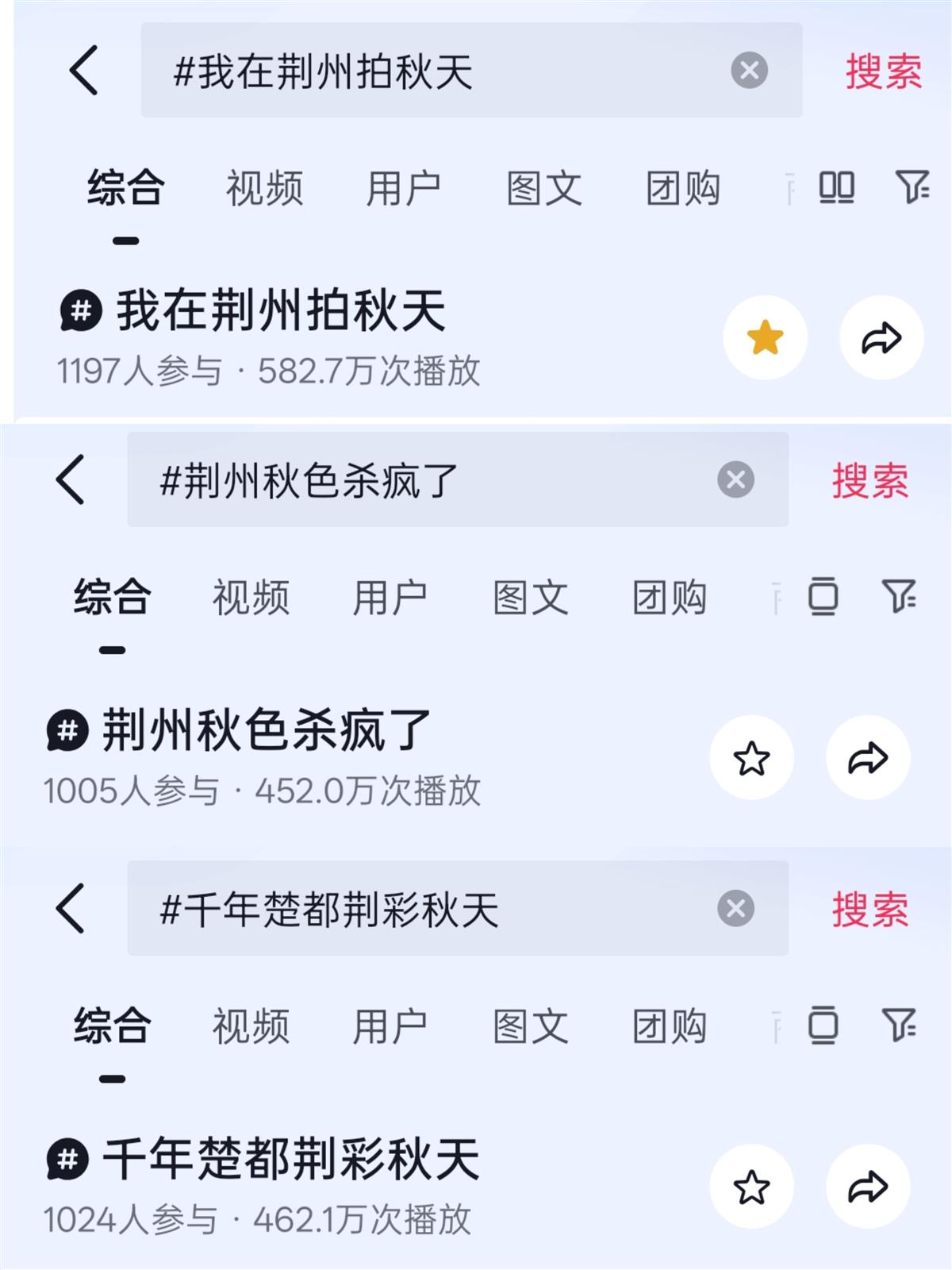爆了!爆了!全民“荐”秋火炽热进行中,“千年楚都 ‘荆’彩秋天——荆州秋色全民推荐官短视频征集大赛” 自11月8日启动以来,短短10天,抖音平台#我在荆州拍秋天#荆州秋色杀疯了#千年楚都荆彩秋天三大话题总播放量超过了1500万次,3000余人参与活动中!小红书、视频号平台也收到全市各地不少粉丝投稿。