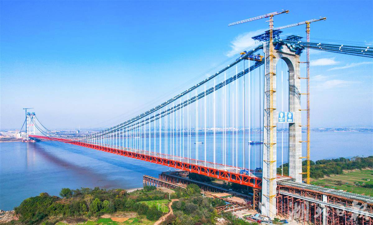 燕矶长江大桥横跨鄂州黄冈两地,采用一跨过江的方式,是世界最大跨径四主缆悬索桥。项目全长约26千米,大桥主跨1860米,上层为六车道高速公路,下层为四车道城市快速路。