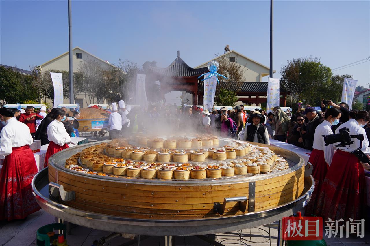 在美食品鉴区,“三山湖九大碗”座无虚席,百余道蒸笼菜品供不应求。东大堤打卡点的手工体验区,游客们亲手制作糍粑、豆丝、鱼丸,感受地道的杜山风味。