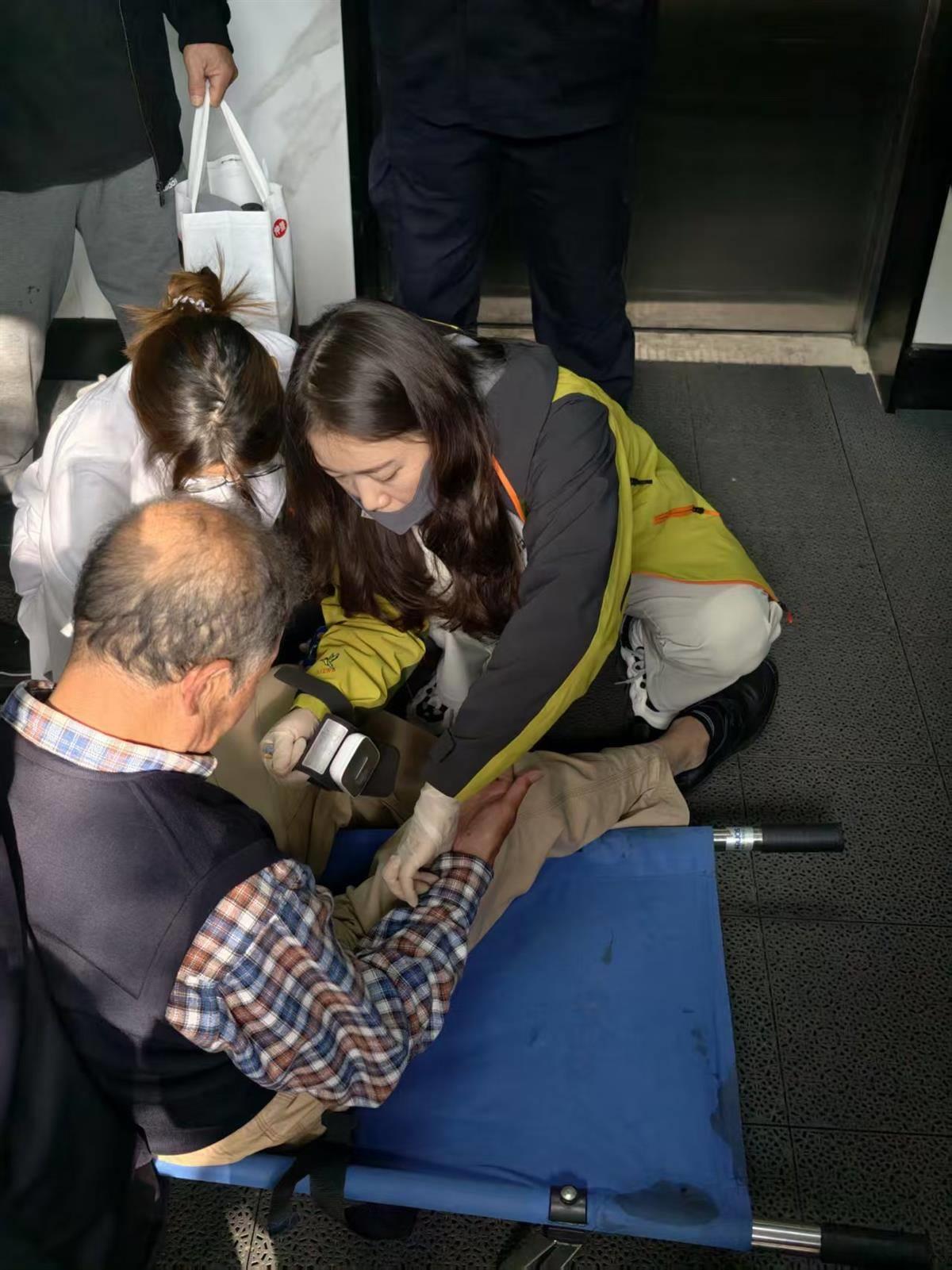 当天,郭丽娟正和家人在登高赏秋,听到呼救声后,她立刻秒回:“我是护士,让我来。”跟随景区工作人员赶到事发地电梯时,她看见一名老人正躺在担架上,面红目赤,呼吸急促,身体不受控制地抖动。