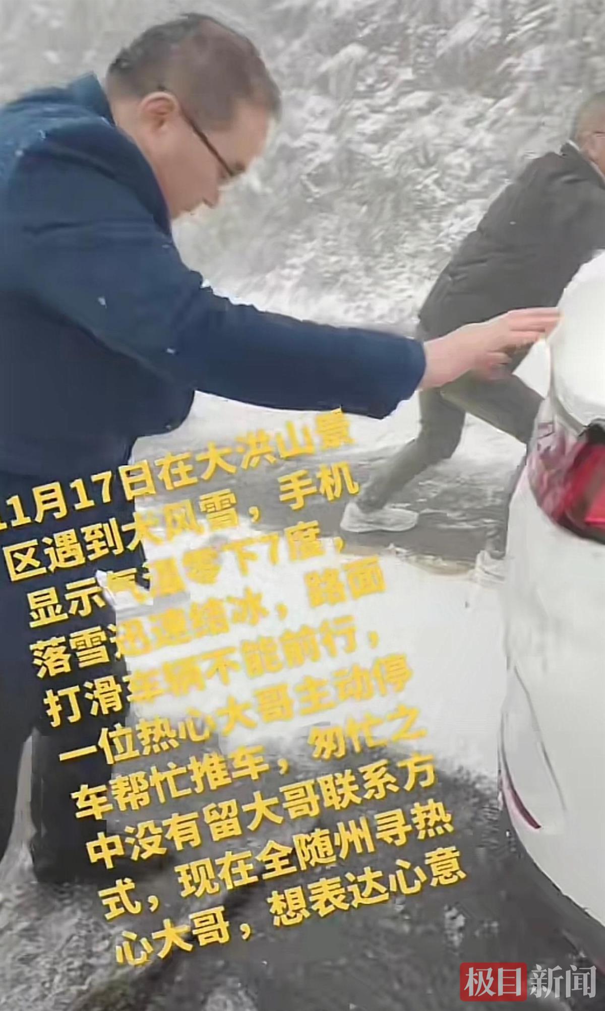据新闻此前报道,11月17日下午,张女士一行驾驶电车在大洪山景区突遇降雪,路面结冰导致车辆在陡坡上打滑被困。正当众人尝试自救无果、救援车辆难以抵达的困境下,汪先生驾驶车牌号为鄂SDQ**9的黑色轿车缓缓停靠在路边,并主动上前询问情况,即使自己穿着单薄的衣服也毫不犹豫加入救援队伍。在他的助力下,车辆成功脱困,而汪先生未留下任何联系方式便悄然驾车离开。这份雪中送炭的善意让张女士满心感激,当晚便通过社交平台发布视频寻人,希望能向这位好心人当面表达谢意。