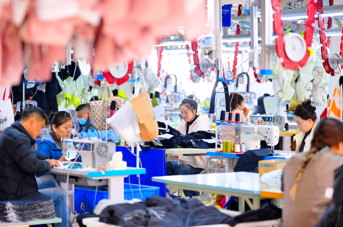 在湖北奥瑟夫制衣有限公司制衣车间,四条银灰色的“空中走廊”有序运转——吊挂系统将裁片精准送至每个工位,工人伸手取料,缝纫机嗒嗒作响,一件件户外服装逐渐成型。