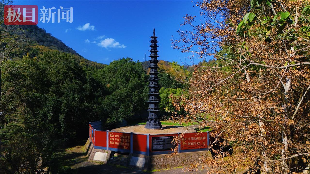 小雪时节刚过,古木参天的玉泉寺内秋意盎然。就在古树掩映的湖边,一座漆黑的铁塔,像一把门神兵器“锏”直指苍穹。