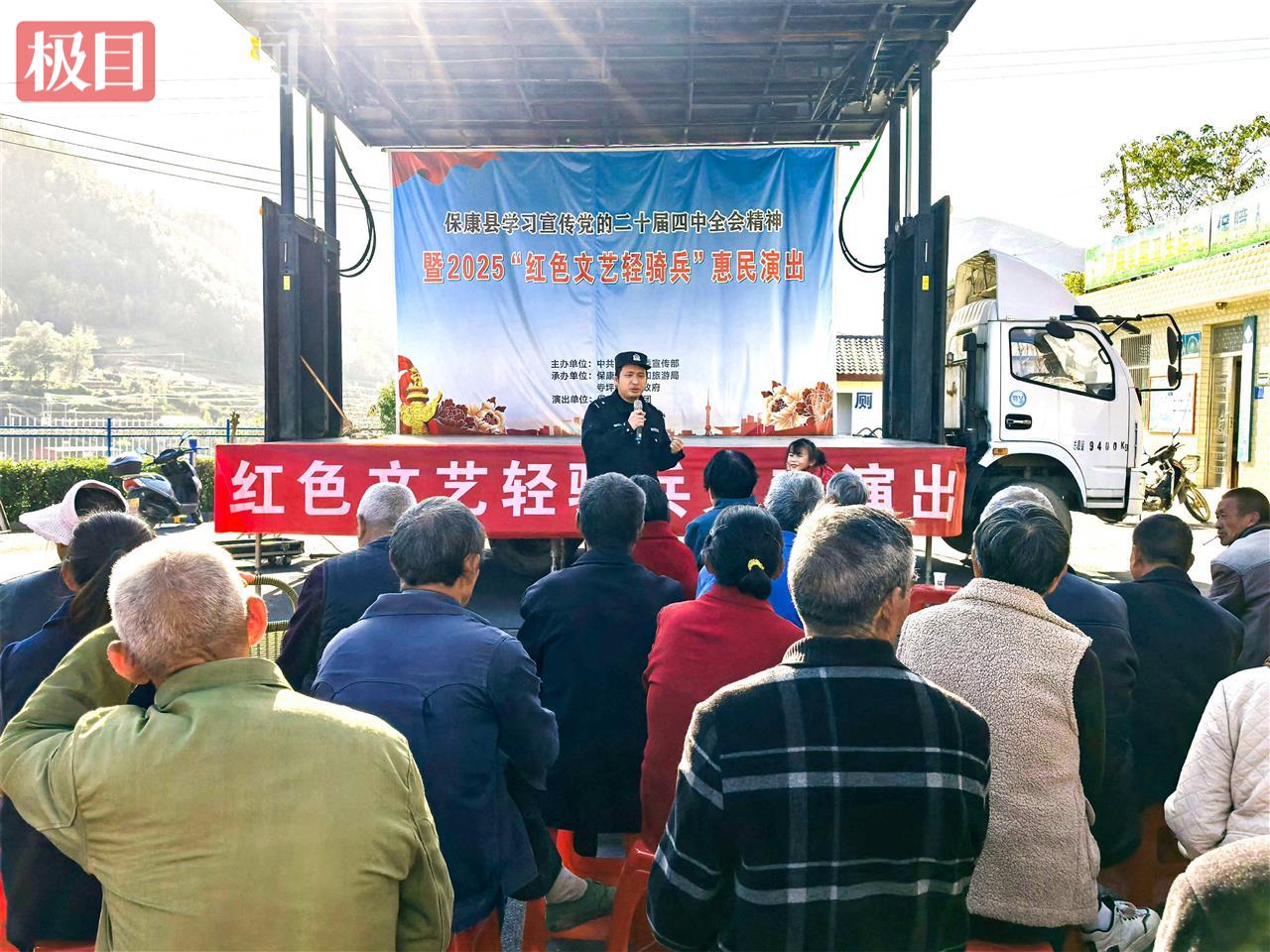 锣鼓喧天歌盛世,平安宣讲暖人心。11月24日,2025年“红色文艺轻骑兵”惠民演出在湖北省襄阳市保康县寺坪镇精彩上演,活动融合党的二十届四中全会精神宣讲与安防知识普及,寺坪派出所民警借台唱戏,将防电信诈骗、交通安全、预防一氧化碳中毒等安防知识嵌入演出全程,让平安理念在轻松氛围中深入人心,全会精神在基层落地生根。