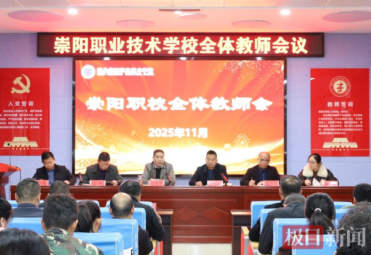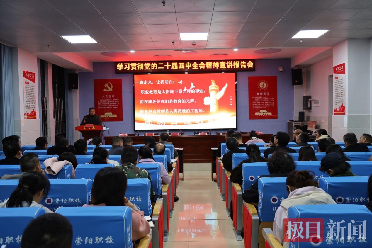 为深入学习贯彻党的二十届四中全会精神,将理论学习成果转化为职业教育高质量发展的动力,2025年11月24日晚,崇阳职业技术学校在小报告厅隆重举行党的二十届四中全会精神宣讲报告会。学校特邀省、市、县三级宣讲团成员王值军老师主讲,全体党员教师共计202人参加会议,在聆听中感悟思想伟力,在共鸣中凝聚奋进力量。