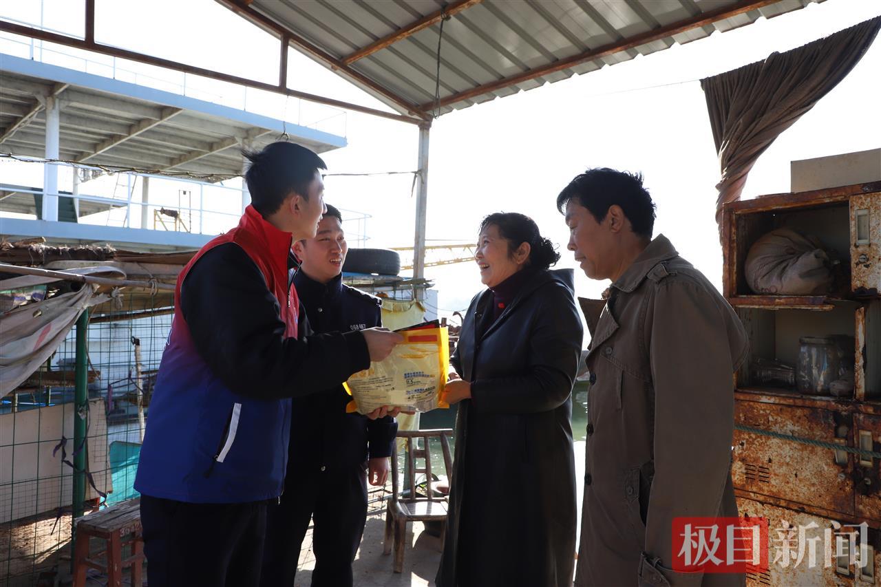 走进夫妇俩的渔船,里间墙上悬挂的一面面鲜红锦旗格外醒目,“救命之恩 永生难忘”“汉江卫士 大爱无疆”等烫金大字,无声诉说着一段段惊心动魄的救人故事。“骆师傅、任阿姨,你们30年坚守初心,用平凡善举书写大爱,真是我们所有人学习的榜样!”民警尹耿天洋握着骆根毛的手真诚地说道。志愿者张雪洋拉着任光琴的手,关切地询问夫妇俩的生活近况与日常起居,考虑到夫妇俩常年在船上生活,民警细致排查电路和安全隐患,反复叮嘱夫妻俩冬季用火用电安全。