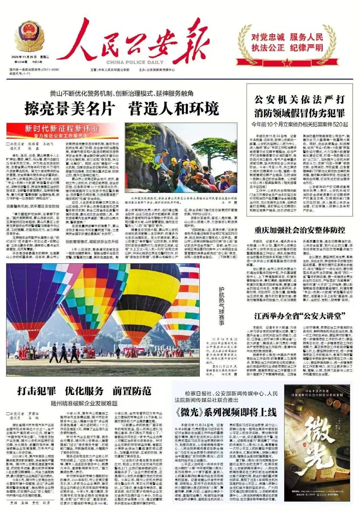 11月25日,人民公安报头版报道《打击犯罪 优化服务 前置防范 随州精准破解企业发展难题》。