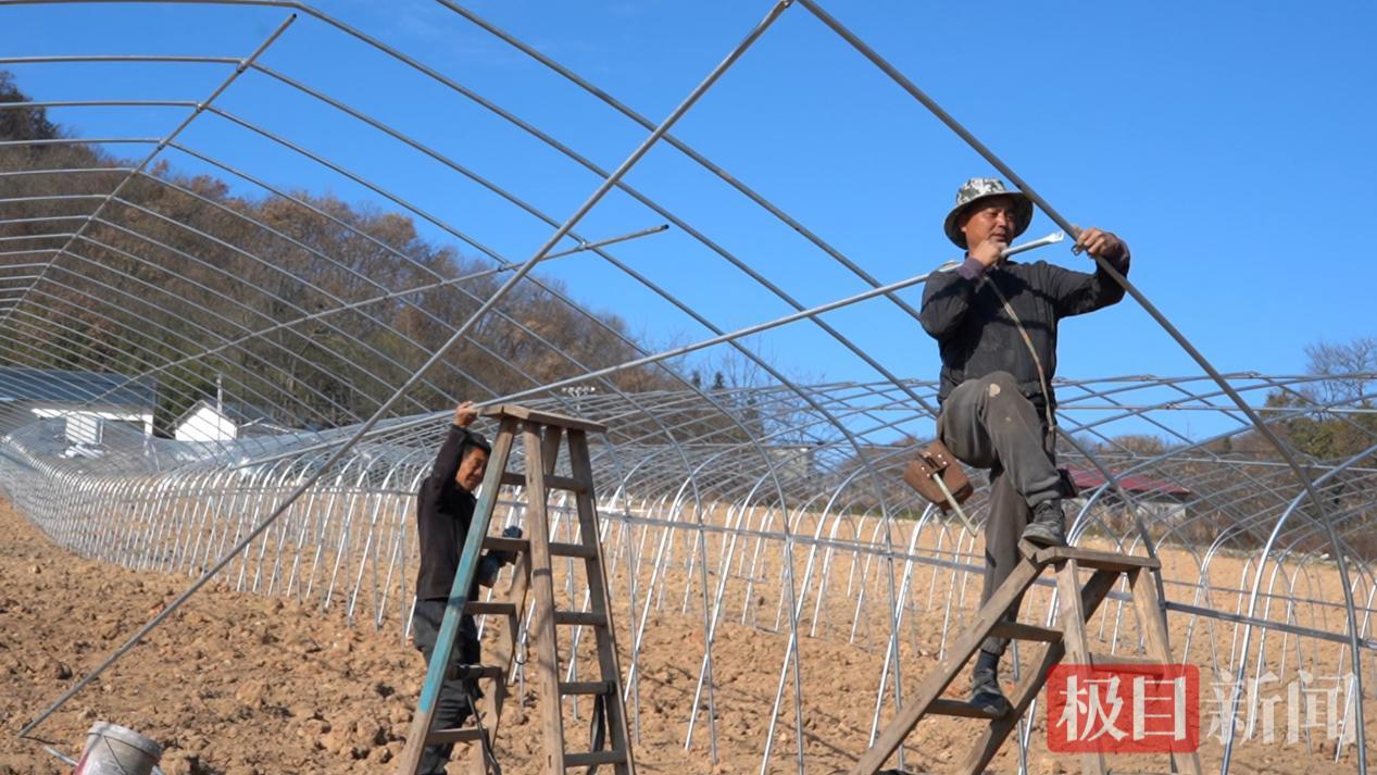 村民正在搭建避雨延秋蔬菜大棚