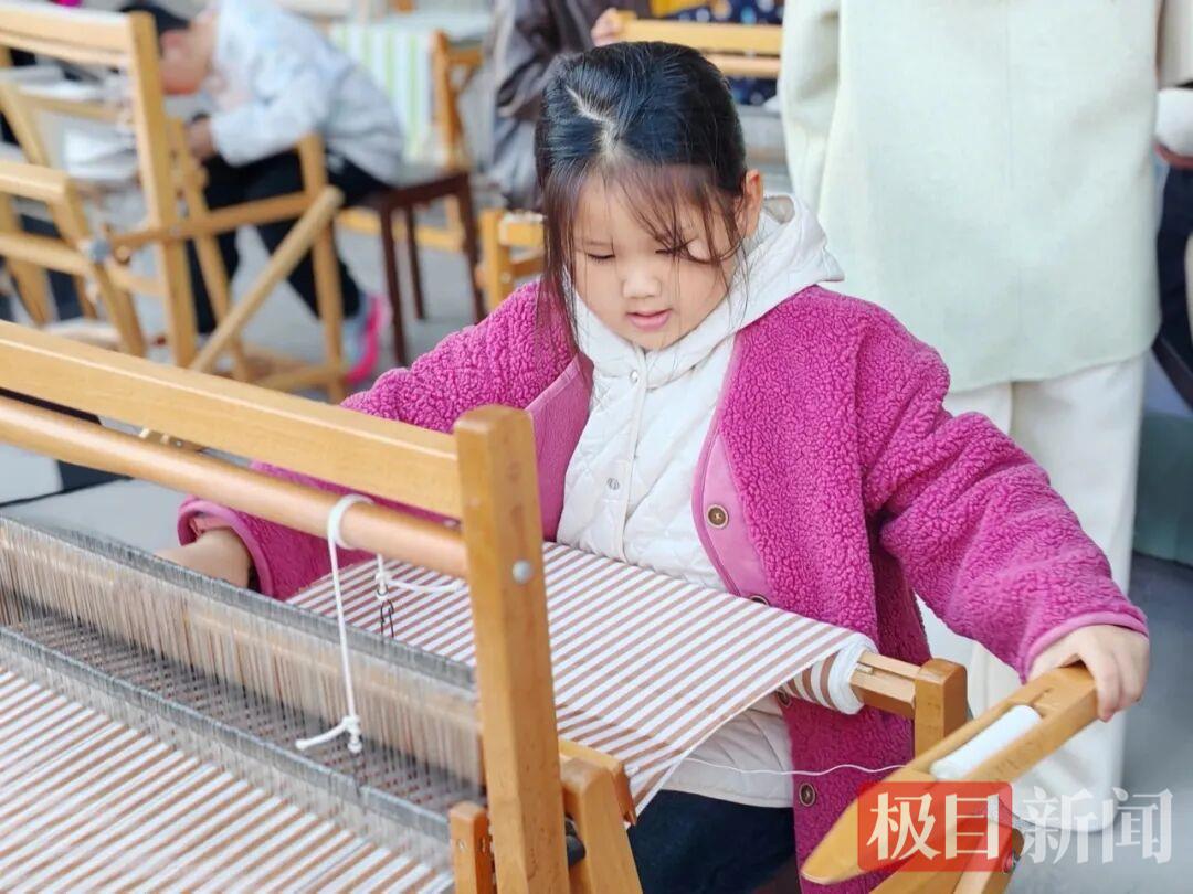 在本次体验课程中,小朋友们化身“小小织布匠” ,在非遗传承人的悉心指导下,了解“纺线、整经、穿综、织布” 的传统流程。双脚交替踏板,双手小心翼翼地抛梭、接梭,再用力推拉木筘,看着零散的丝线在经纬交错中逐渐成型,感受“经纬分明”的古老哲学,看着渐渐成型的小小布料,孩子们脸上露出了惊喜的笑容。