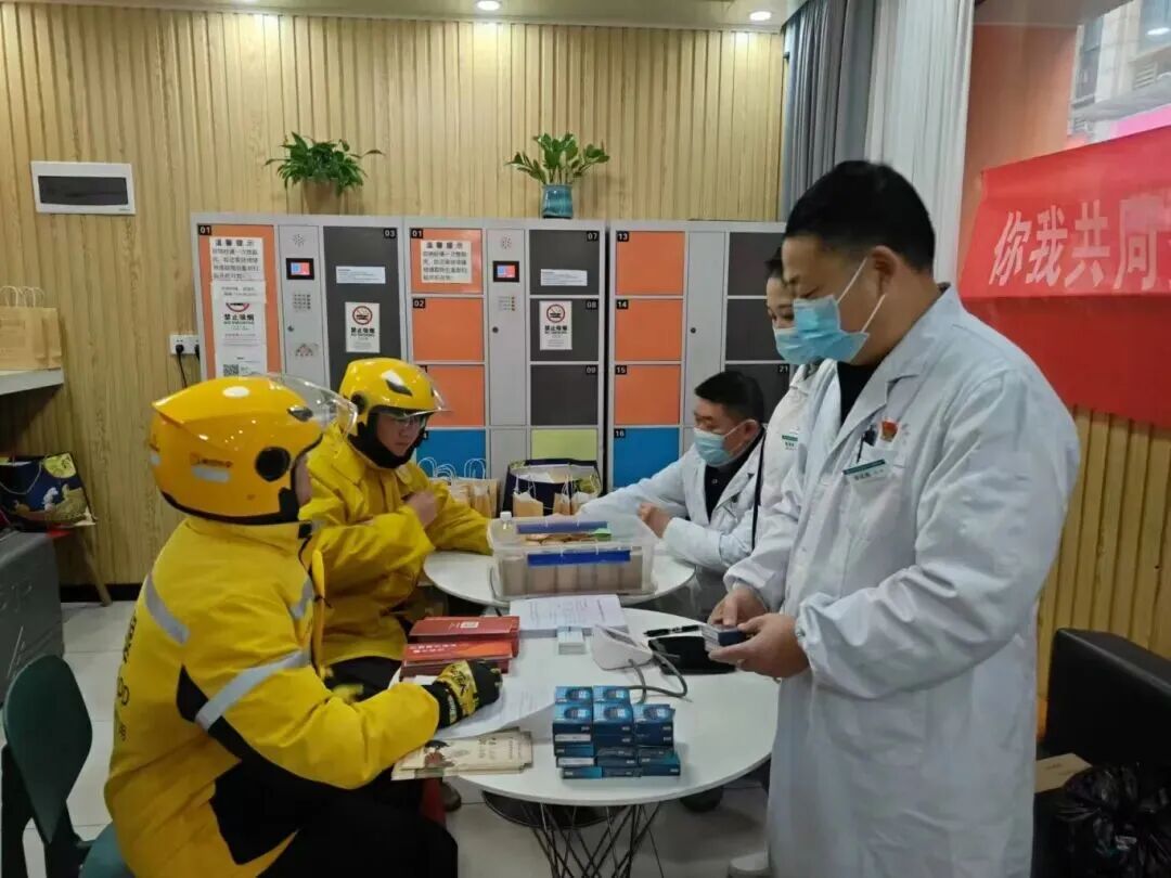 外卖员在爱心驿站参加社区义诊活动