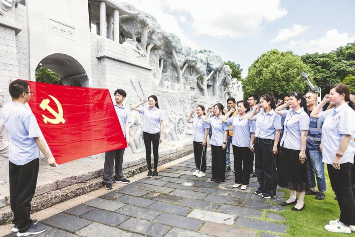 在武昌起义门,中建三局总承包公司湖北公司多项目党支部开展主题党日教育活动,缅怀革命先烈,学习敢为人先首义精神。 (湖北日报全媒记者 任勇 摄)