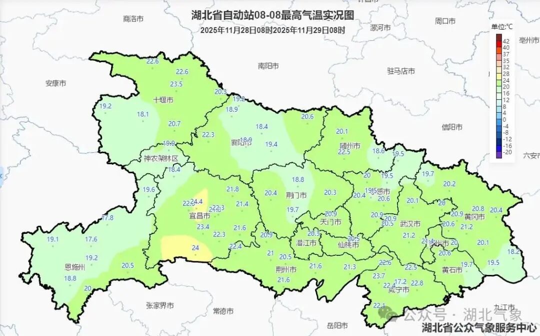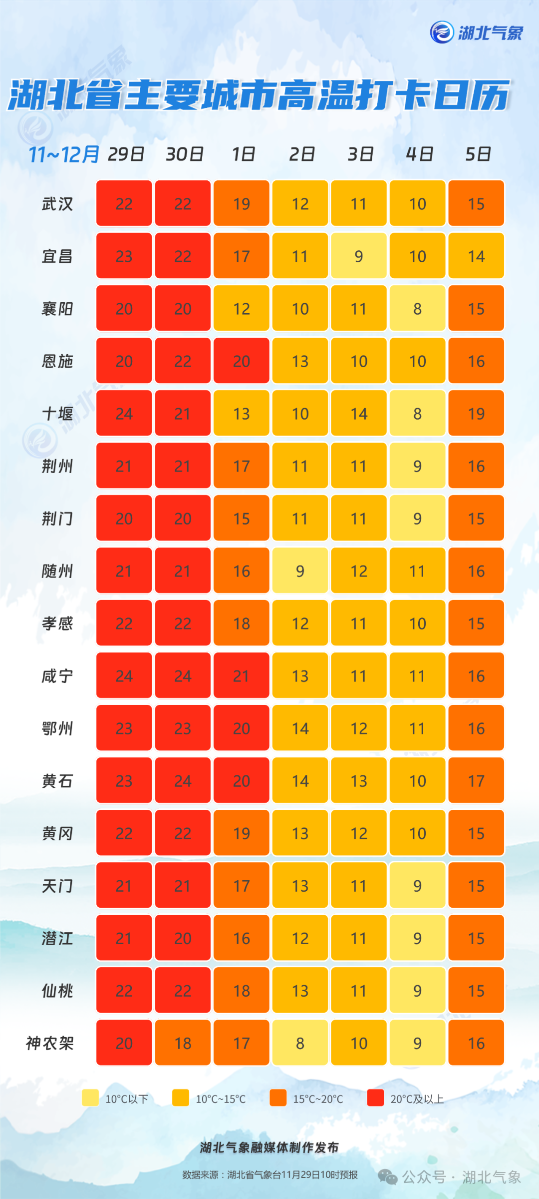 11月30日08时-12月1日08时,全省晴天到多云。最高气温鄂西北18~22℃、其他地区22~25℃,最低气温2~9℃, 偏北风2到3级、阵风4到6级。