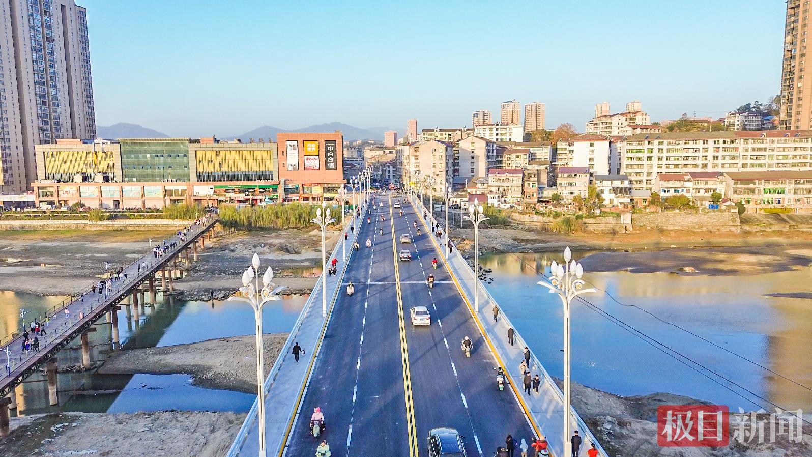 新建成的东门大桥,长232米、宽20米,总投资约3955万元,按公路一级荷载标准建设,双向两车道搭配专用人行道,配套完善景观灯夜间照明、排水等设施,通行能力与安全保障水平大幅度提升。桥面宽阔平整,标线清晰,路灯、护栏等配套设施一应俱全,不仅外观现代大气,其内在的“筋骨”也更为强健。