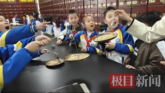 走进古色古香的中药房,百余个木质药斗整齐排列,药香扑鼻。“这是戥秤,古人就用它来精准称量药材。”药师的介绍吸引了孩子们的目光。在动手环节,学生们小心翼翼地操作起传统铜制戥秤,在秤杆起落、砝码增减间,亲身感受中药配制“一厘一毫”的严谨。
