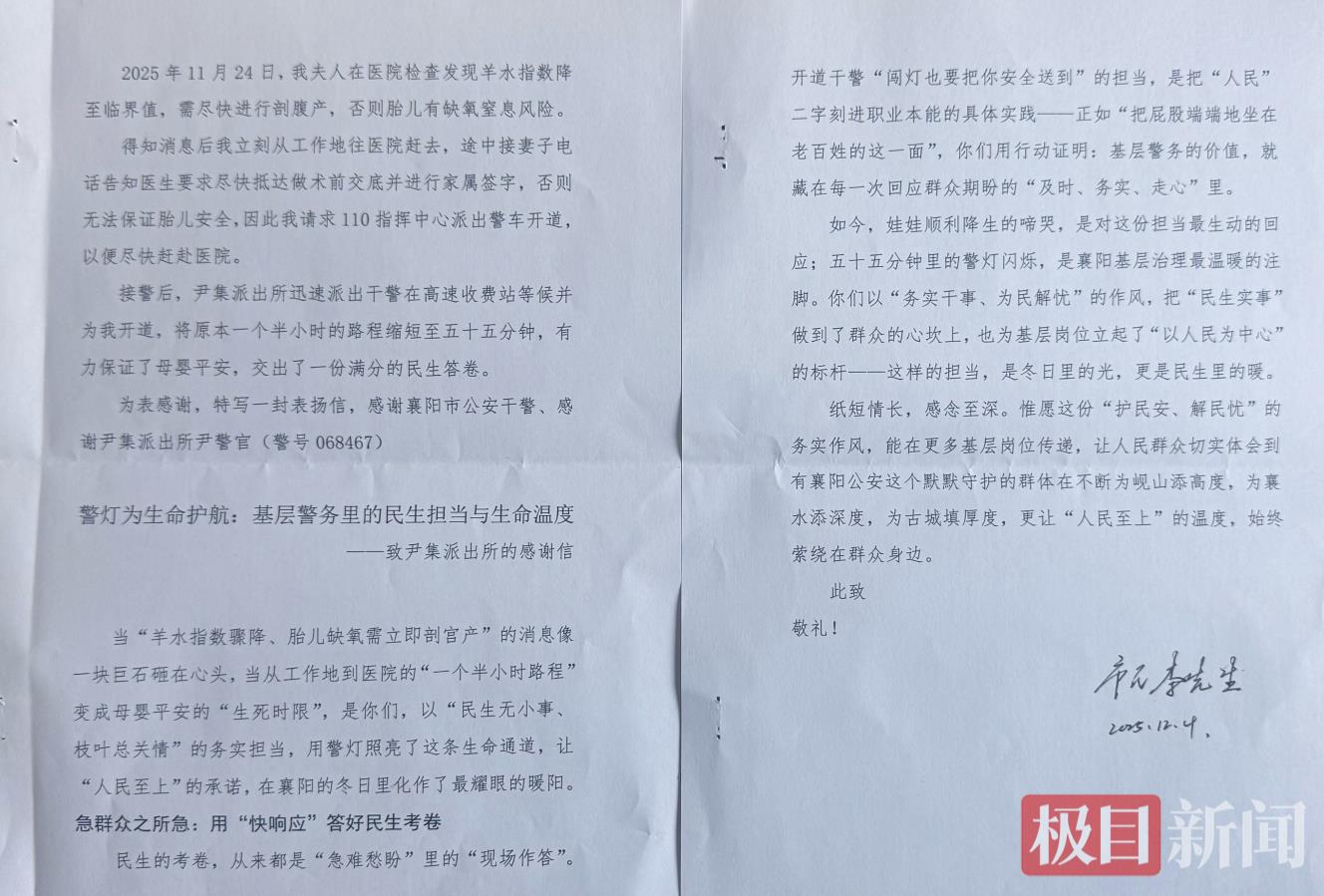 12月4日,李先生将一封感谢信送到尹集派出所:“那天看到警灯的瞬间,我就知道‘有救了’。五十五分钟里的警灯闪烁,是我们家这辈子最暖的光。”